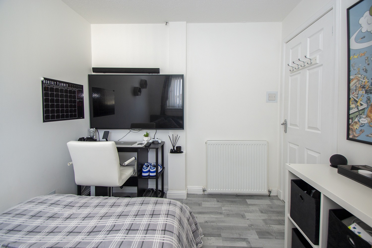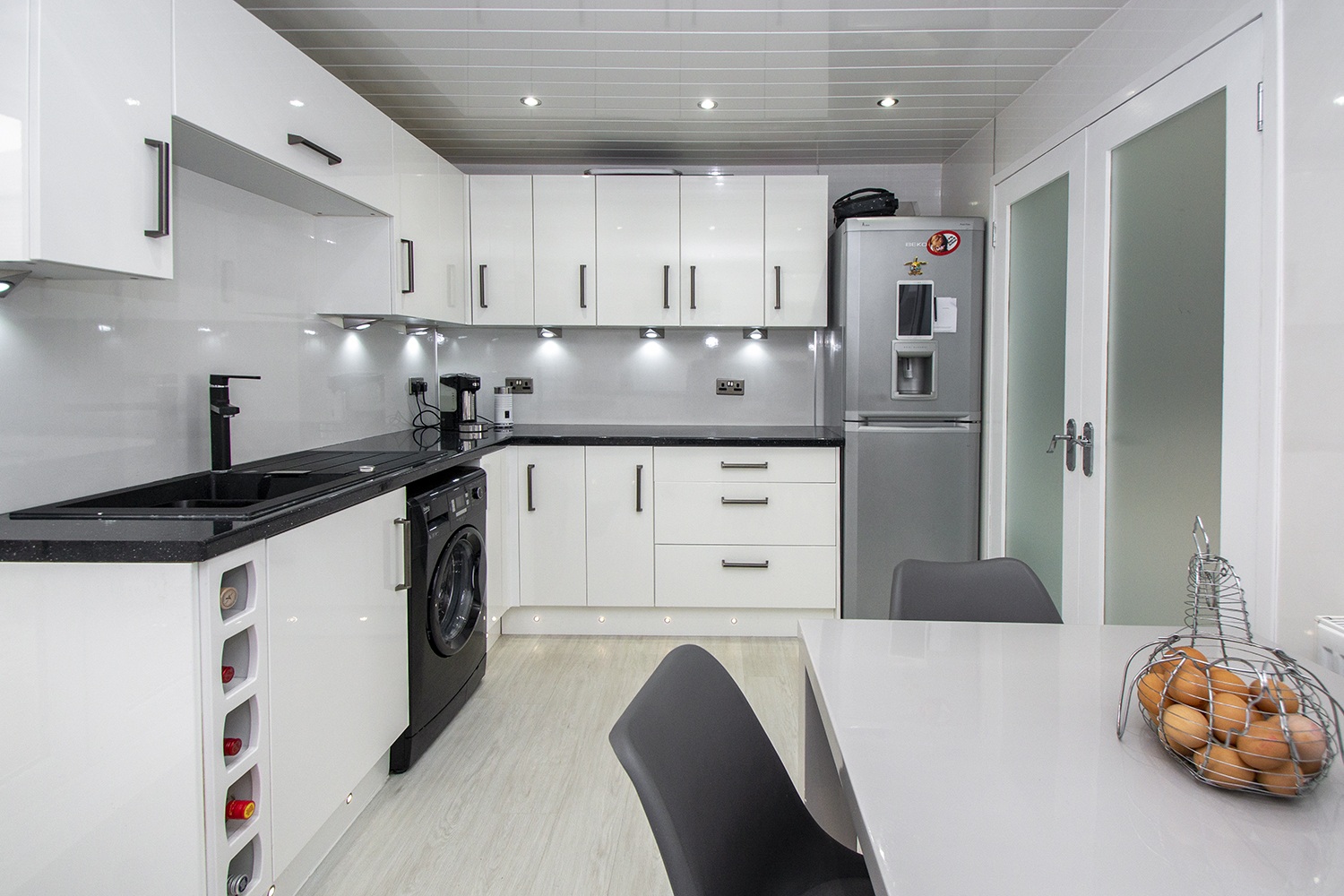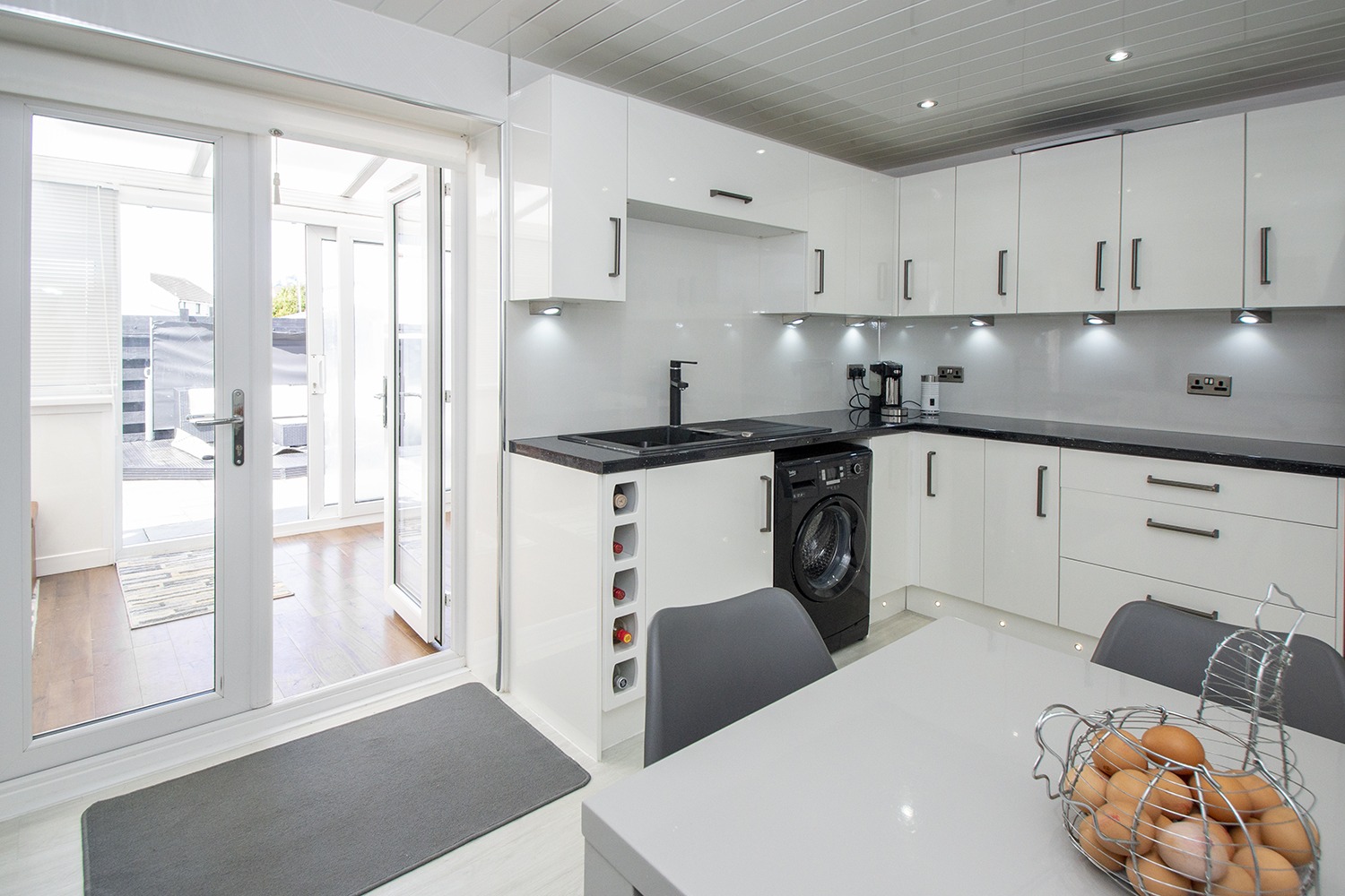 This spacious family home is laid out over two levels with the lower level comprising entrance hallway, well-proportioned front facing lounge with contemporary décor which gives access to the kitchen/diner and which houses an ample range of base and wall units with complementary worktops and splash-back areas. Modern hob with extractor and electric oven and microwave, plumbing for automatic washing machine. French doors give access to bright and airy conservatory with French doors giving access to the fully landscaped rear garden. On the upper level there are two good sized bedrooms with modern décor, fitted wardrobes and quality flooring and a family bathroom comprising of wc, wash hand basin and bath with shower over.