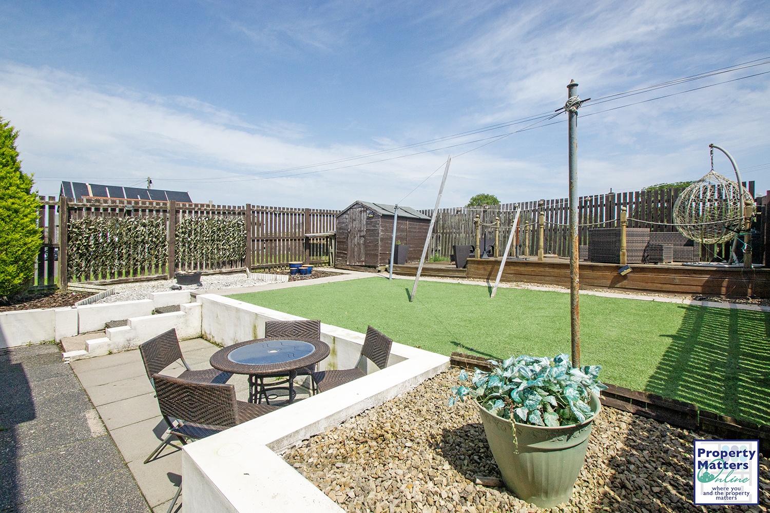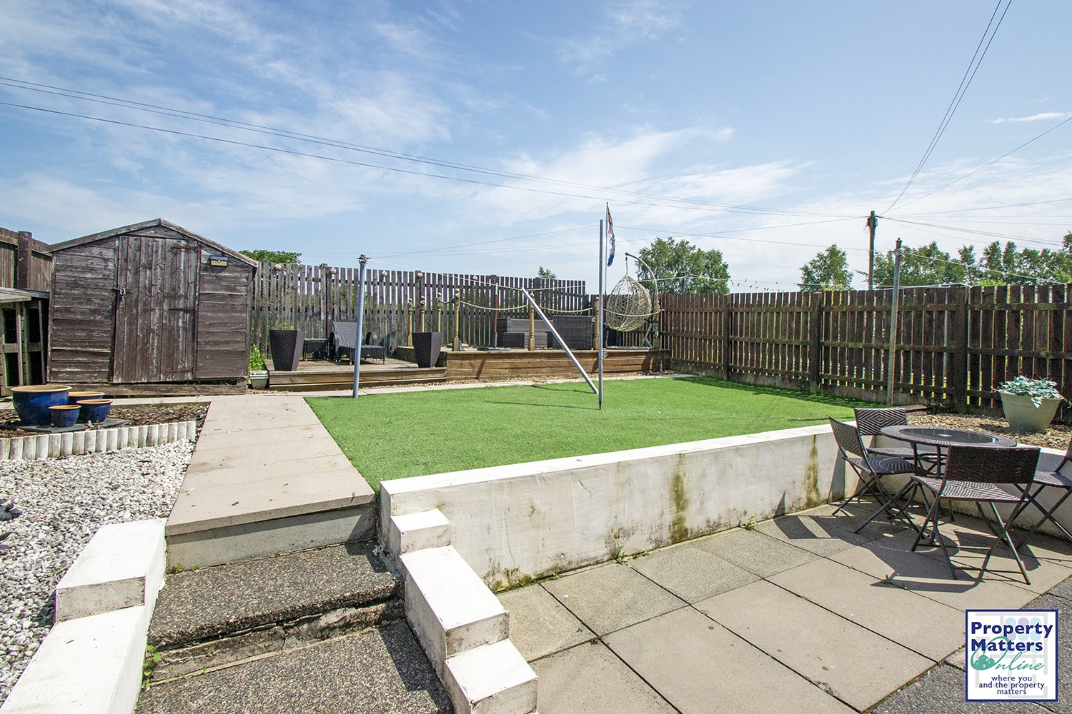 Externally, the front garden is attractively landscaped with decorative chips, enhancing the property’s kerb appeal. The rear garden is fully enclosed and comprises a mix of artificial grass, paved patio, decorative chips, and a decked area, perfect for outdoor entertaining, all while enjoying open views of the surrounding countryside.