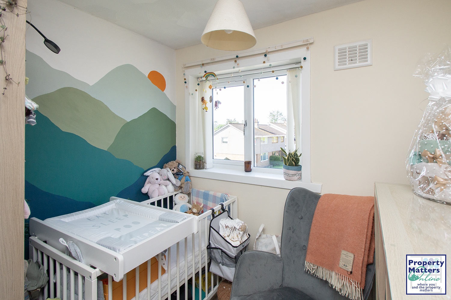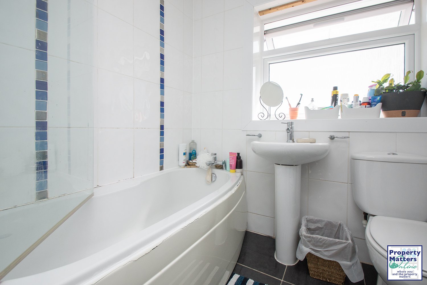 Upstairs, the property features a bright landing, complete with a storage cupboard, two generous double bedrooms, and a spacious single bedroom with a built-in storage cupboard. The family bathroom is fitted with a bath and overhead shower, WC, and wash hand basin.