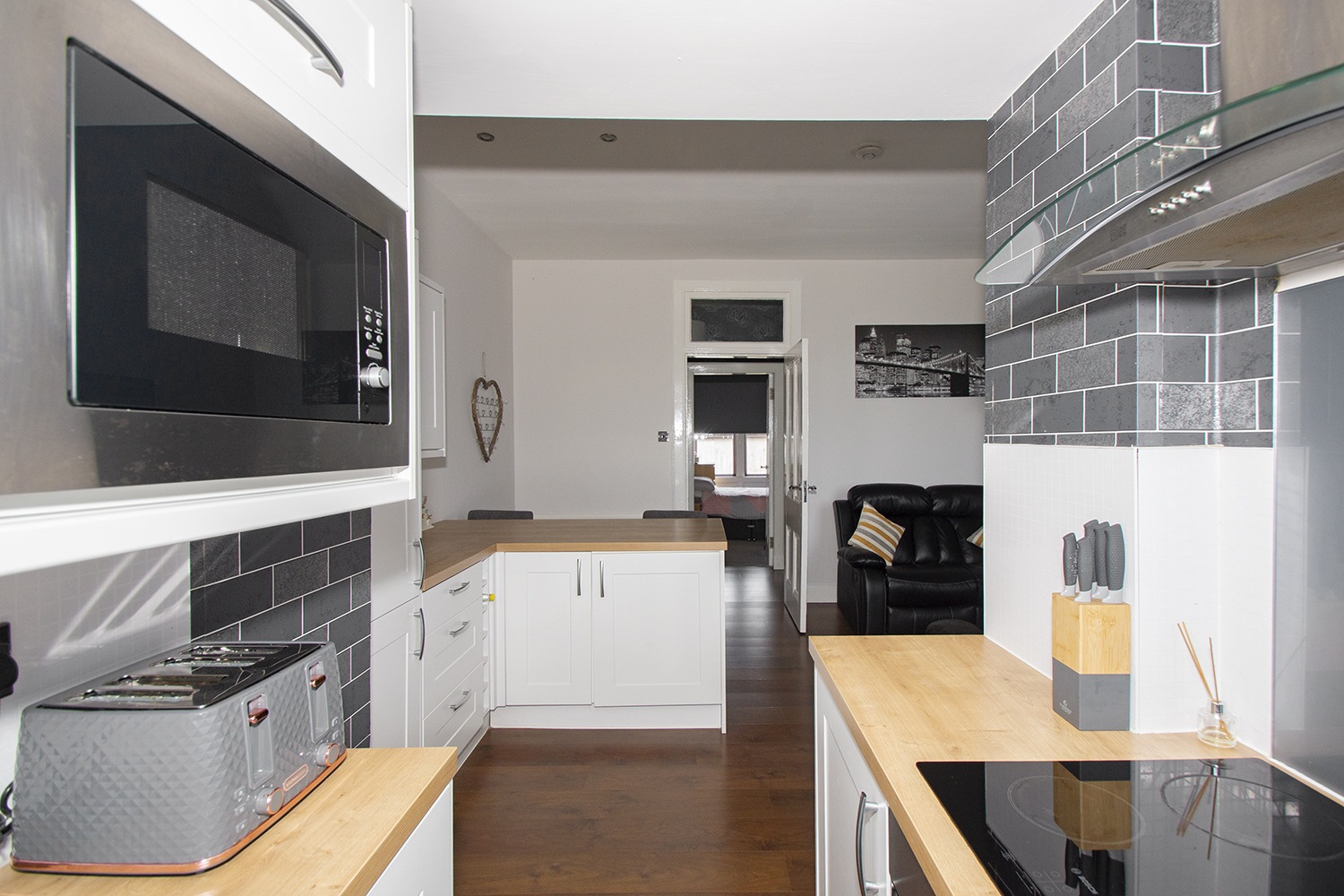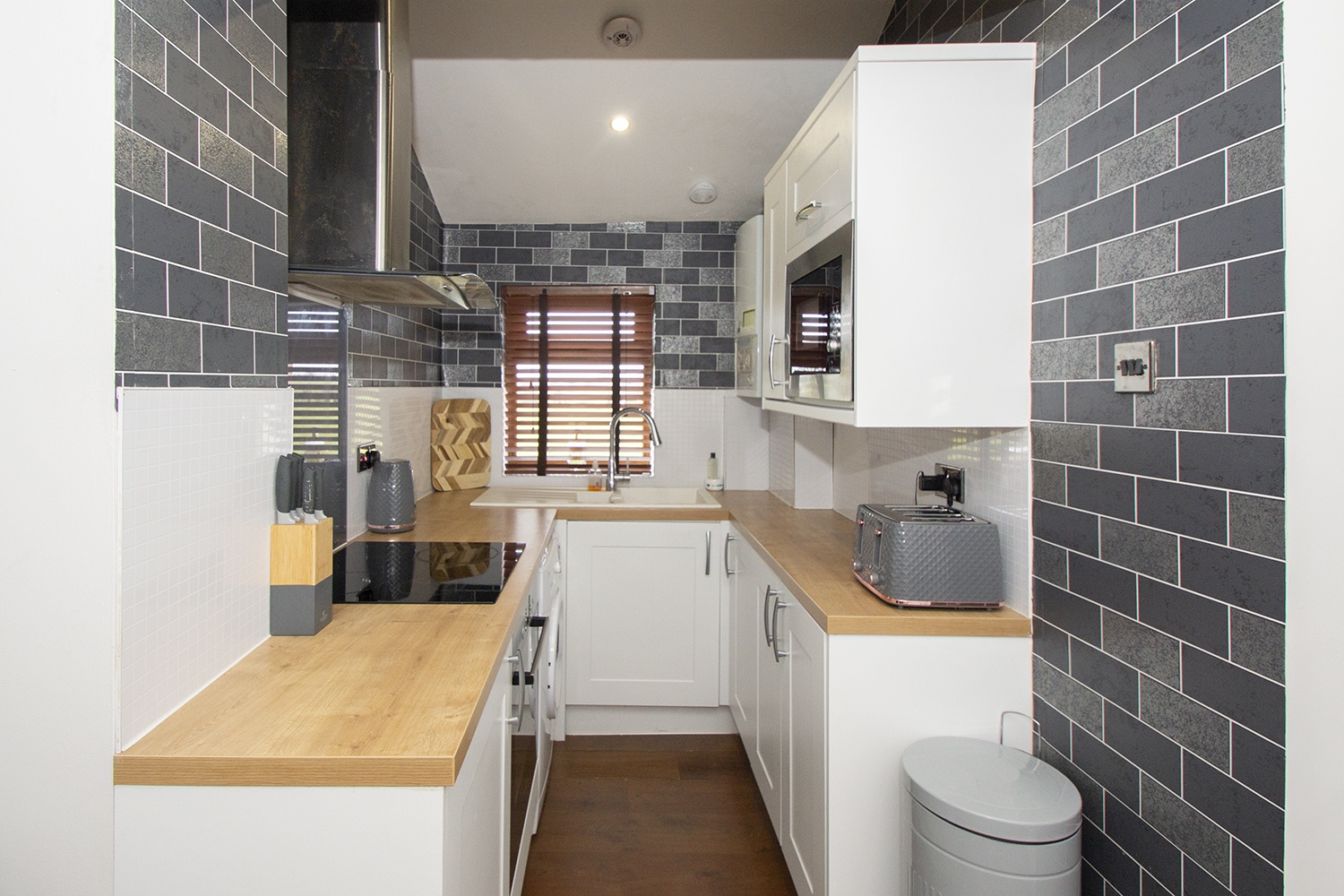 Open plan kitchen area with range of units and complimentary worktops. Window to rear with open views. Inset sink with taps. Appliances including electric hob, oven washing machine and microwave. Ample power points.