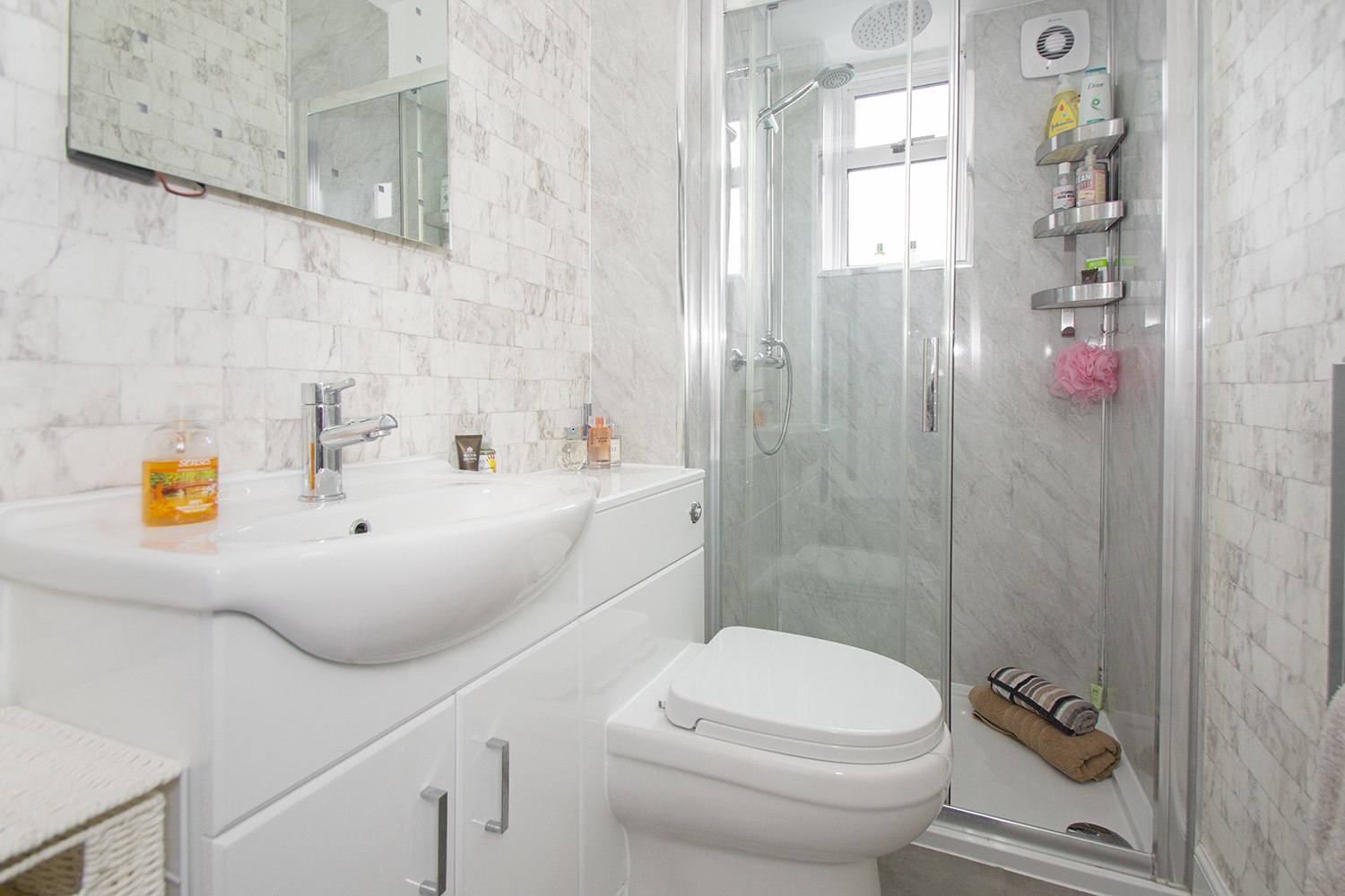 Modern shower room with side facing window. 3 piece family bath suite comprising wc and wash hand basin and shower enclosure. Modern vanity units. Vinyl flooring.