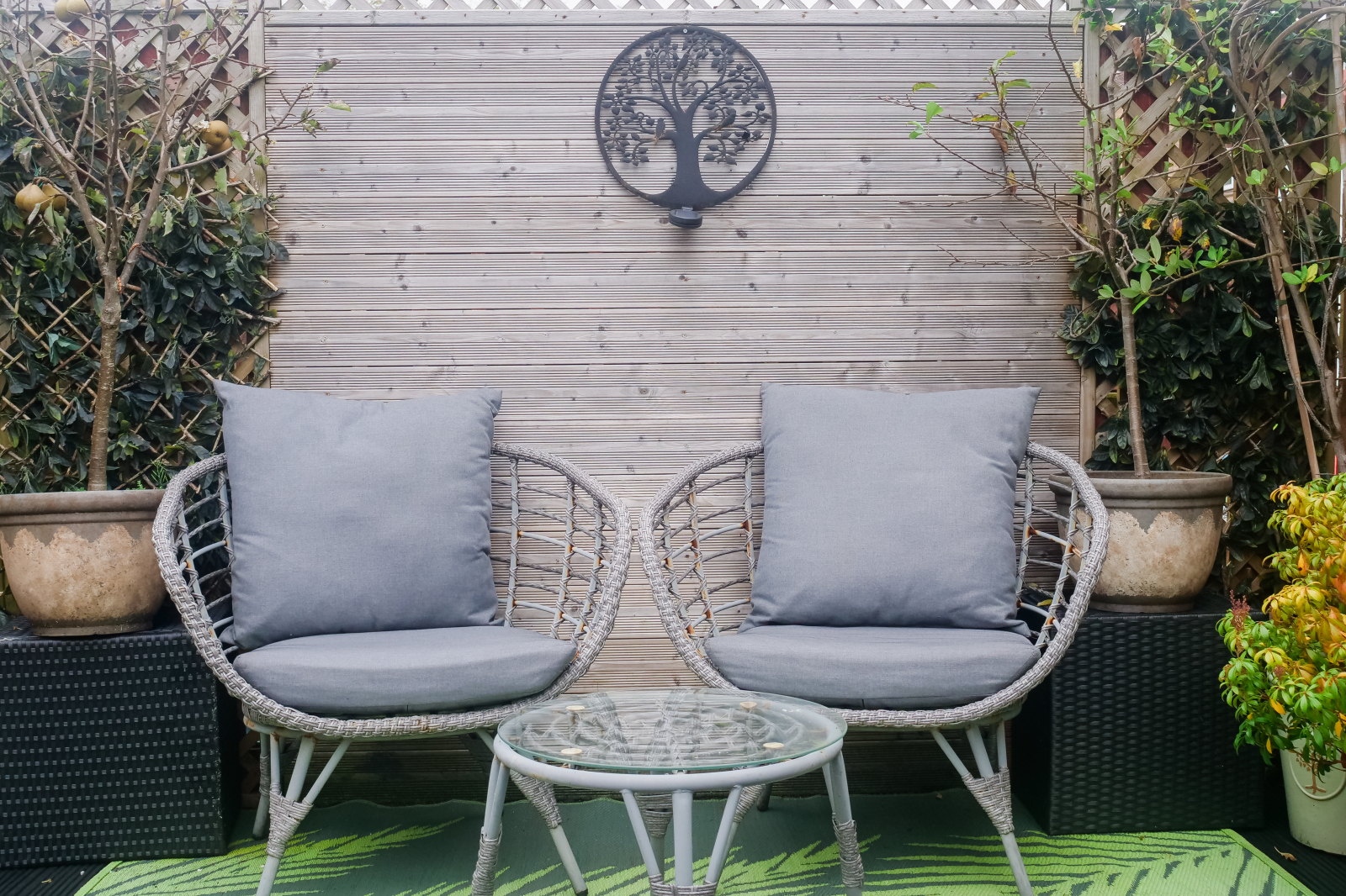 Externally, the front garden features artificial grass, a decorative chipped area with a mature tree, and a tarmacked driveway providing generous off-street parking. The enclosed rear garden is similarly low-maintenance, laid with artificial grass, decorative chippings, and a decked seating area, ideal for outdoor entertaining.