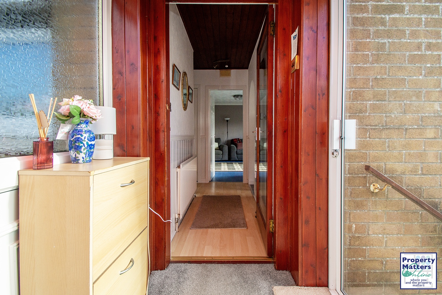 The property features a spacious front garden, beautifully laid to lawn, and a private driveway with ample parking space. An additional single garage provides even more convenience. Upon entering the home, you’re greeted by an inviting entrance porch that leads into the hallway.