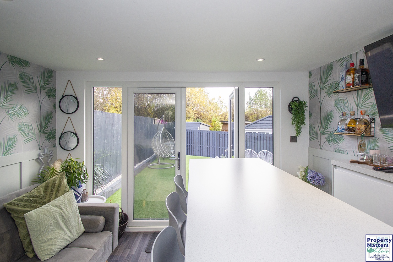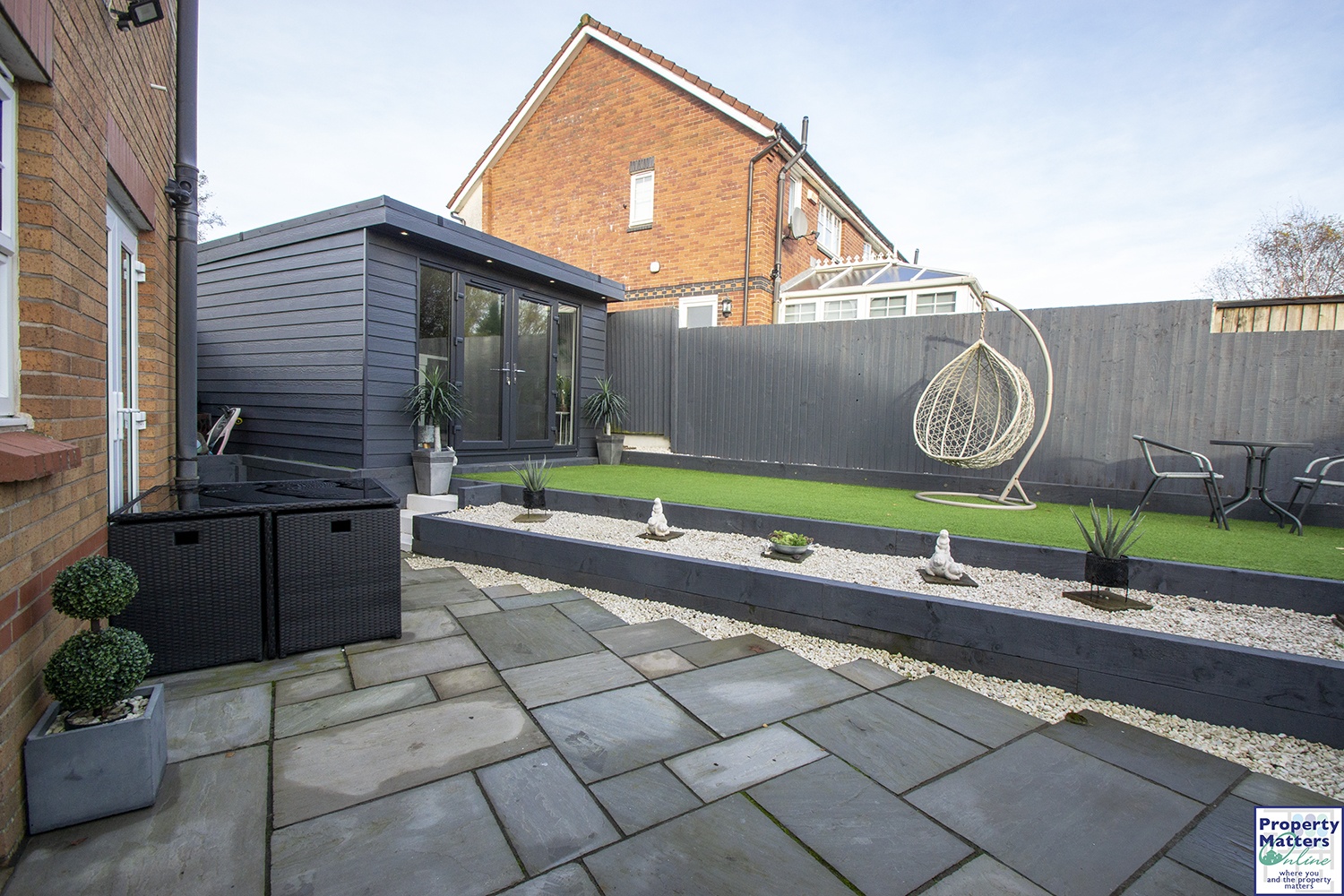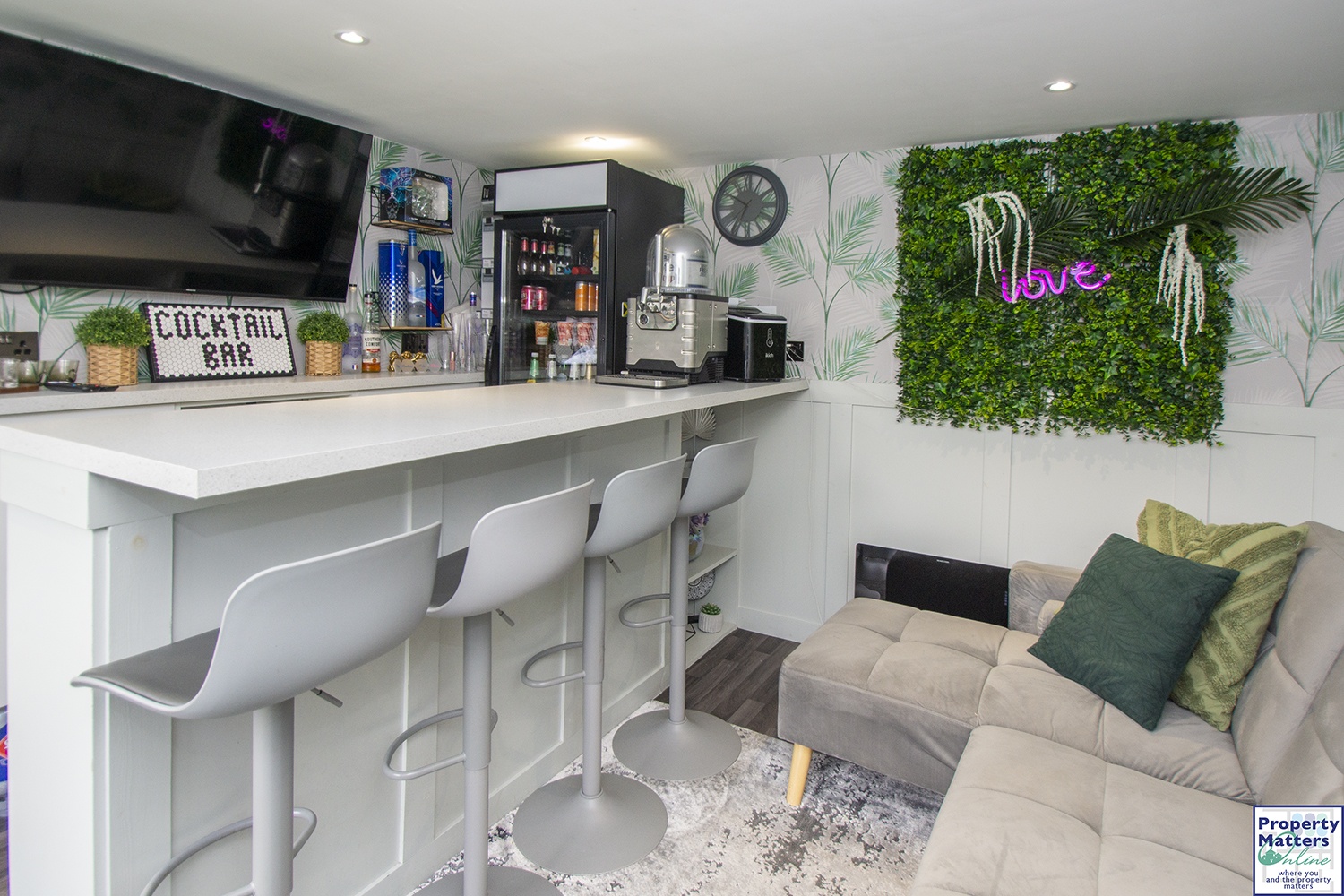 The property has a large driveway to the side and fully enclosed rear garden. The garden has been landscaped with patio area and artificial grass. Offering great privacy this is a great space for relaxation and entertainment. In addition, there is bespoke outdoor room which has been fitted out as a bar/seating area. This could serve many uses including home office etc.
