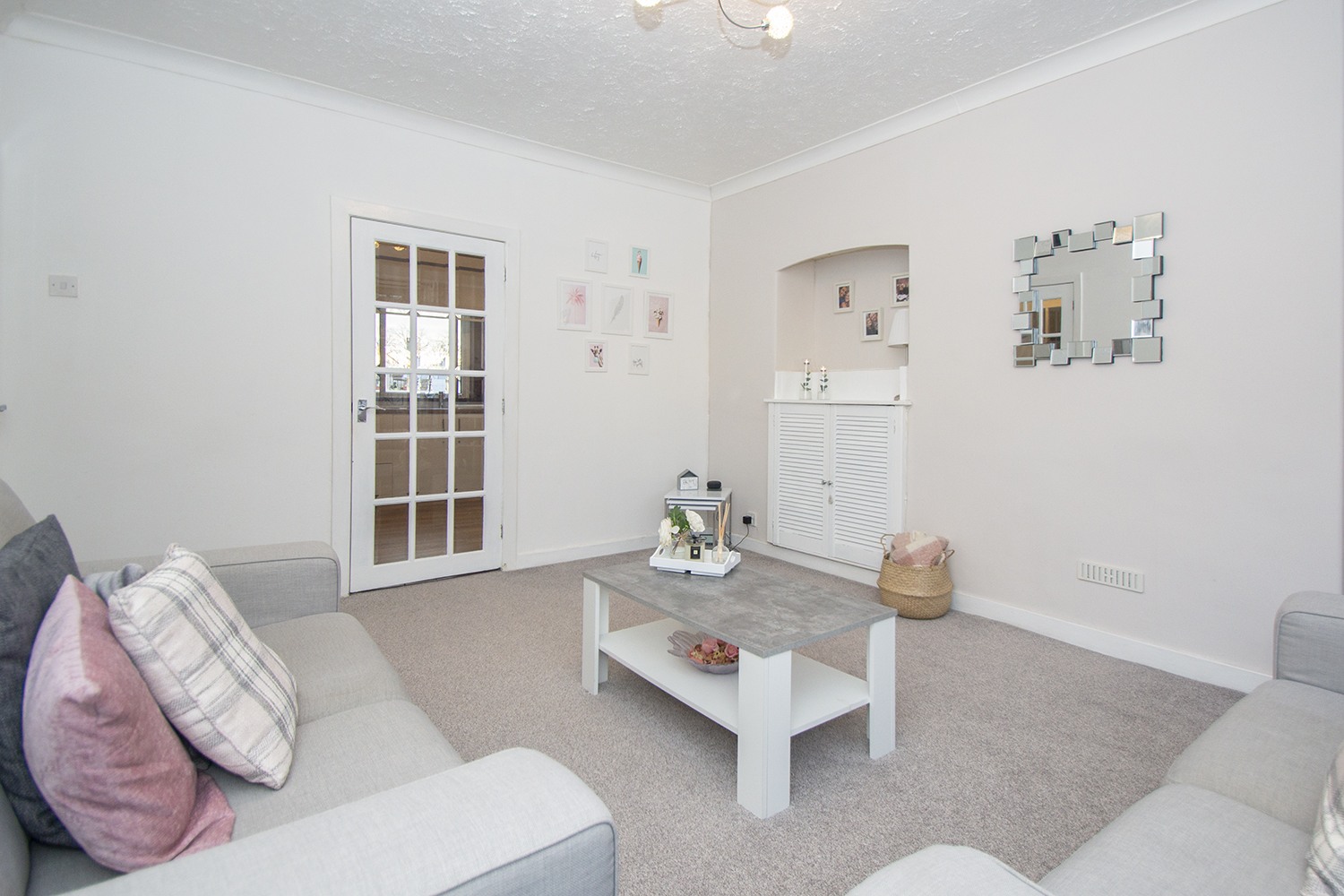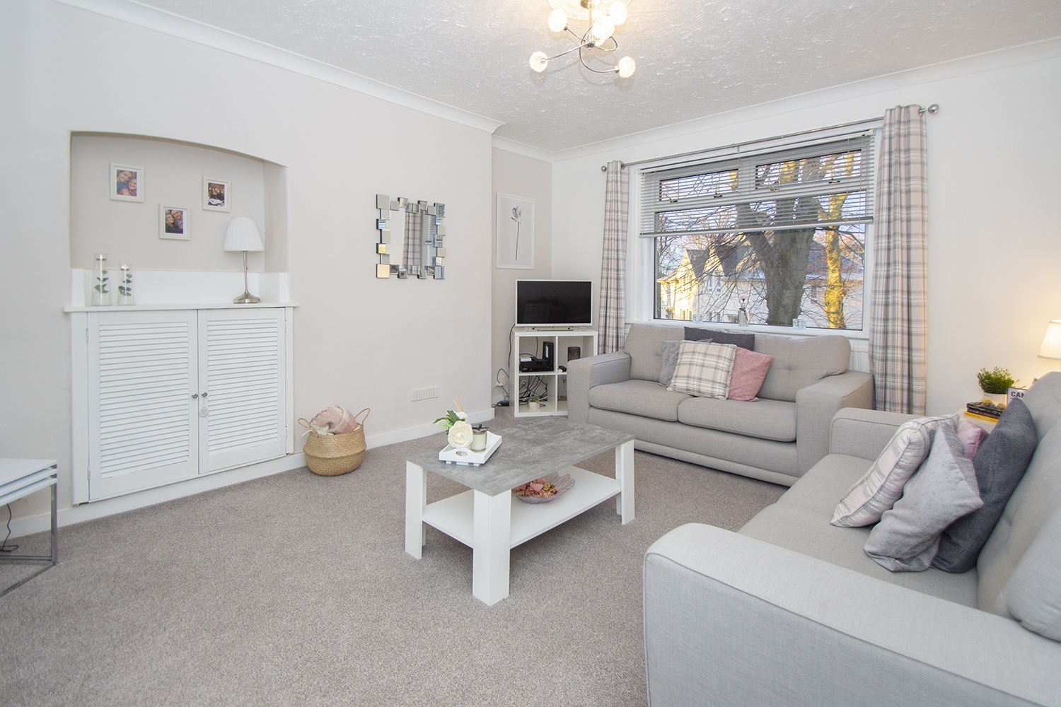 The accommodation is immaculately presented throughout and comprises welcoming entrance hallway with large storage cupboard; bright and spacious front facing lounge with feature alcove area. Contemporary dining kitchen which houses an ample range of base and wall units with complementary worktops and tiled splash-back areas and space for dining. Two well-proportioned double bedrooms with built in wardrobes. Modern three-piece bathroom comprising wc, wash hand basin with vanity unit and bath with overhead electric shower.
