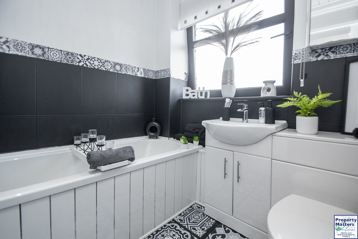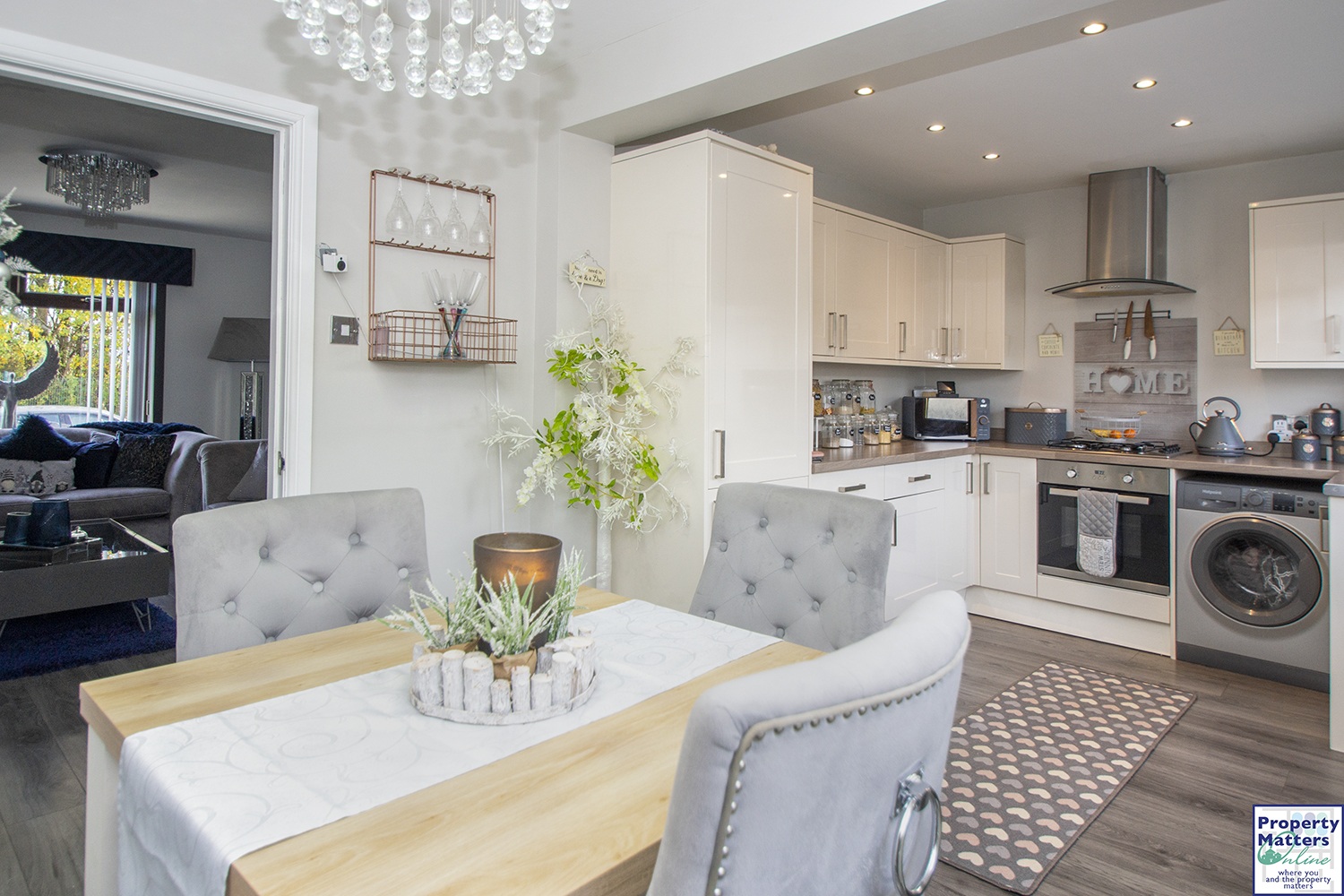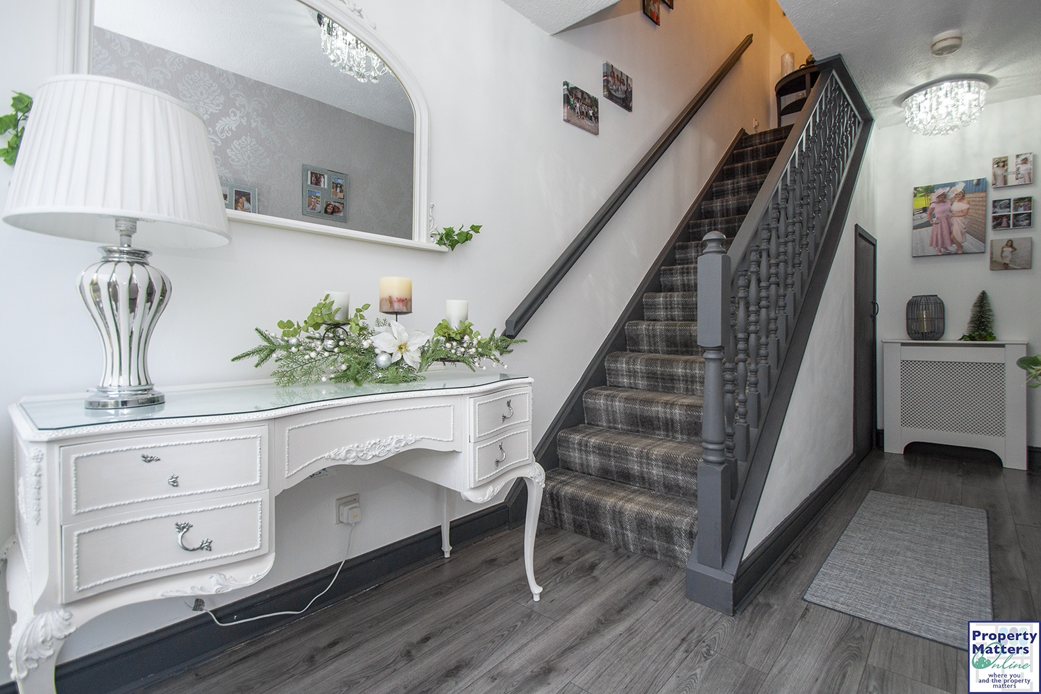 This stunning family home has been maintained to a high standard throughout and is formed over two levels with the lower level comprising welcoming entrance hallway with bespoke under stair storage. Front facing lounge leading to the kitchen/dining area housing ample range of wall and base units, integrated oven and hob, plumbing for automatic washing machine. The upper-level comprises of three spacious bedrooms with all bedrooms comprising of handy storage cupboards. Three-piece family bathroom comprising of wc, wash hand basin and bath.