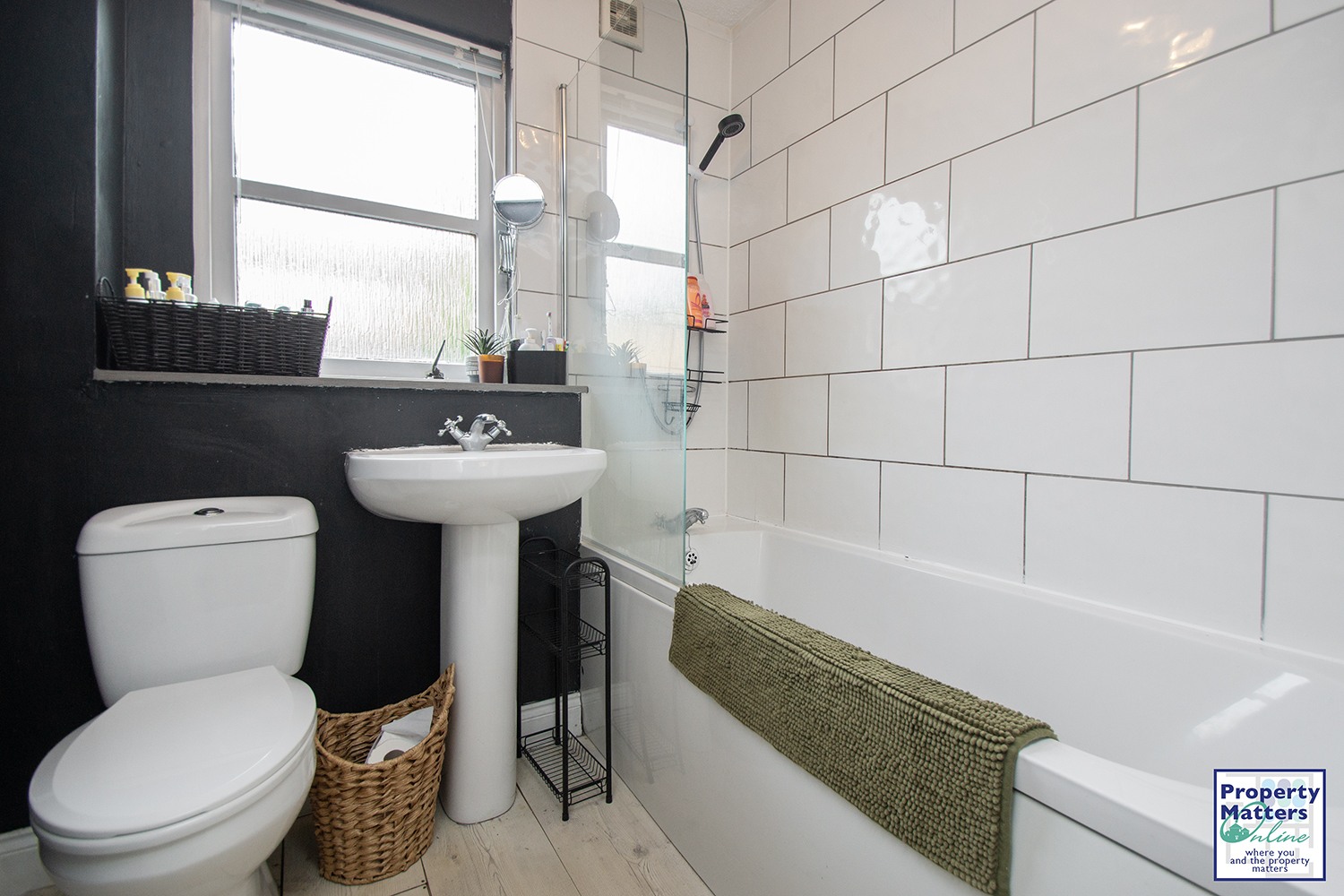 · Contemporary three-piece bathroom, complete with bath with shower over and tiled splashback area.