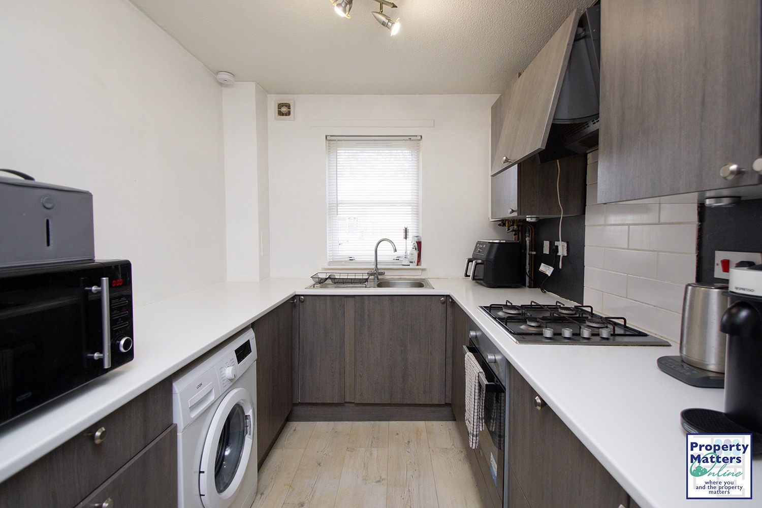 · Modern fitted kitchen featuring an ample range of base and wall units, complementary worktops, tiled splashback areas, and integrated appliances, including a gas hob, oven, and extractor. Plumbing for automatic washing machine.