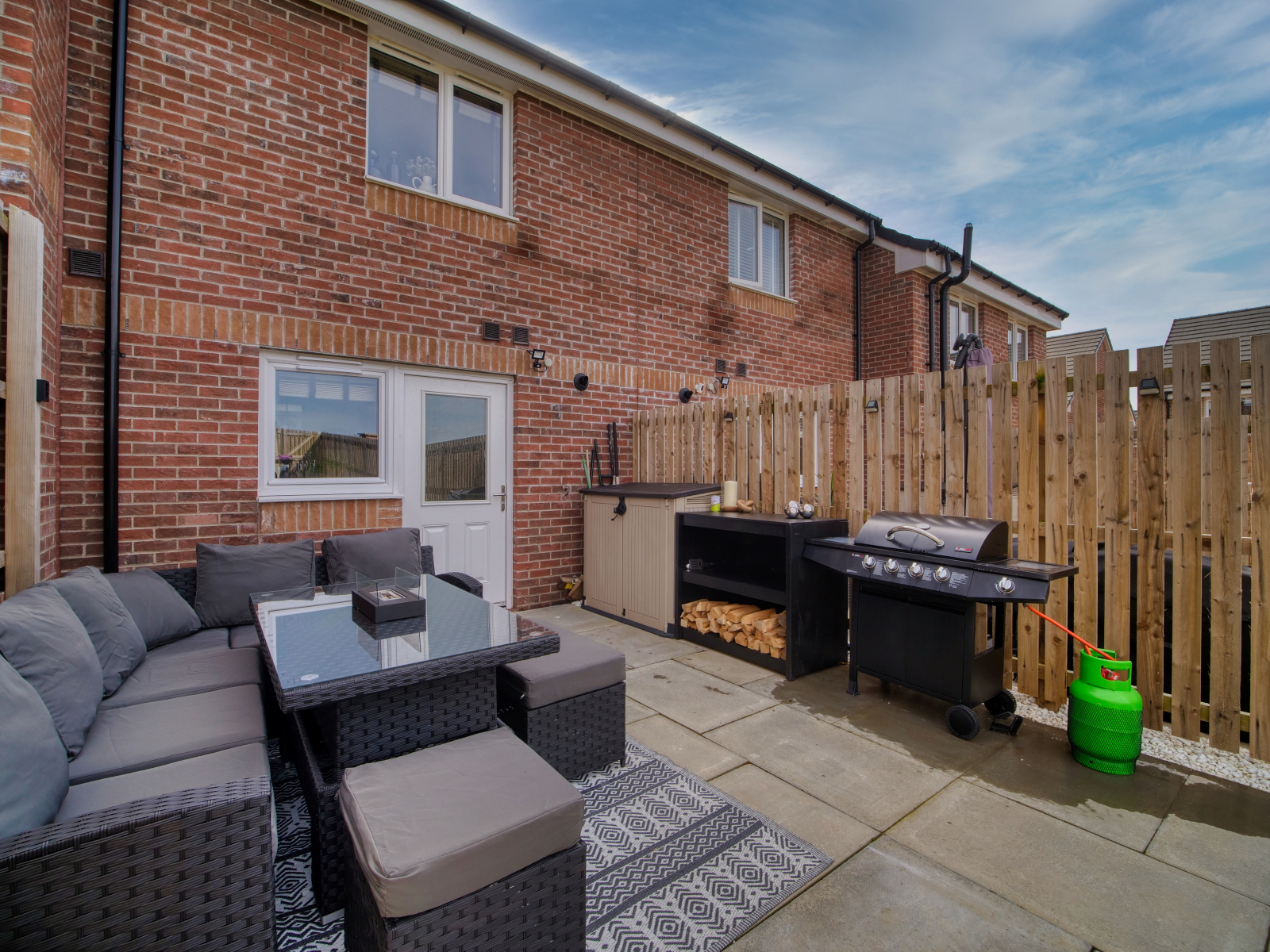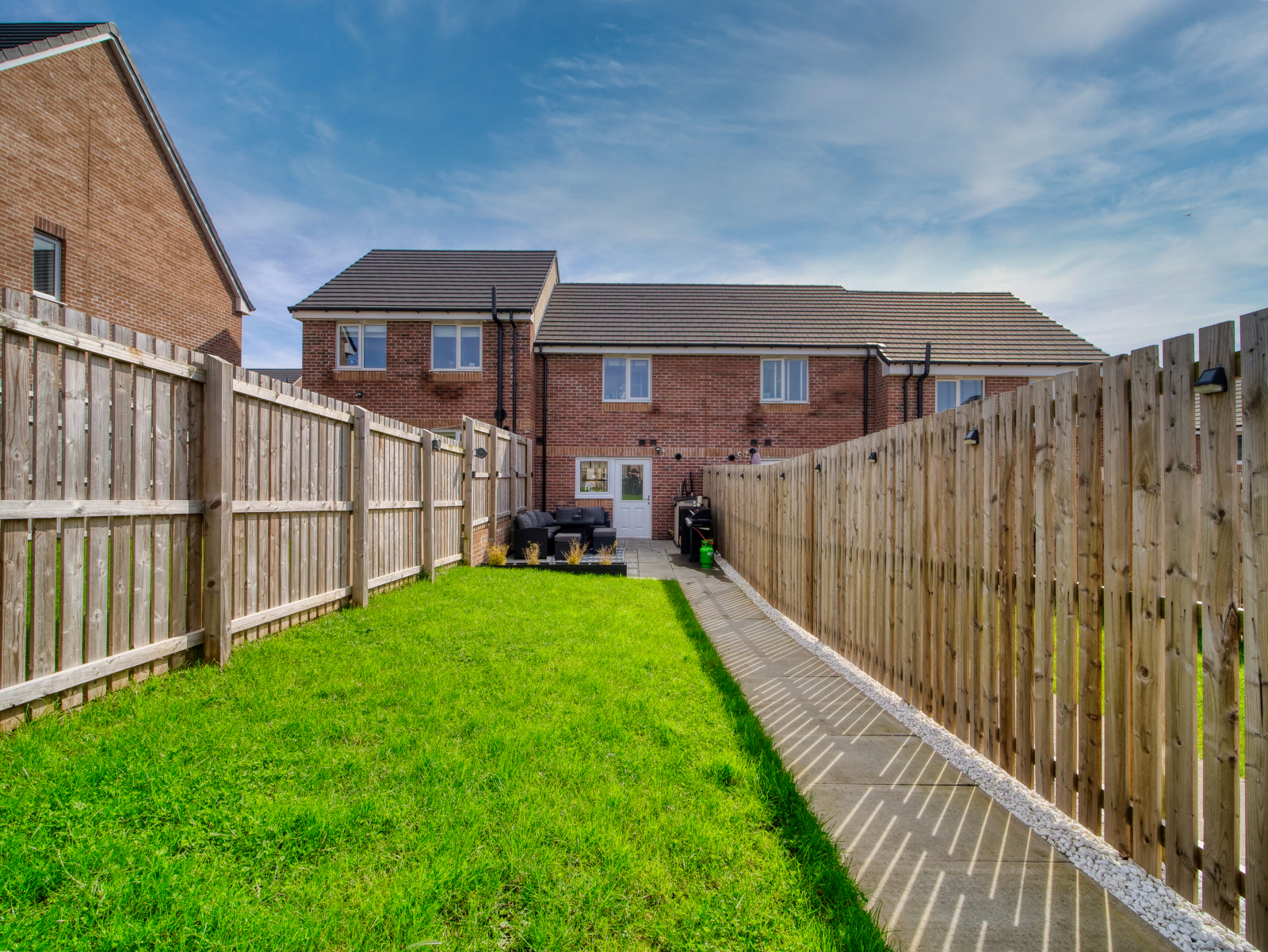 Externally, the property features a neatly maintained front garden laid to lawn. The enclosed rear garden is also laid to lawn and includes a slabbed patio area, perfect for outdoor dining and relaxation. A rear gate provides access to the private parking area, which includes two allocated spaces. The home also enjoys a position close to attractive open green space within the development.