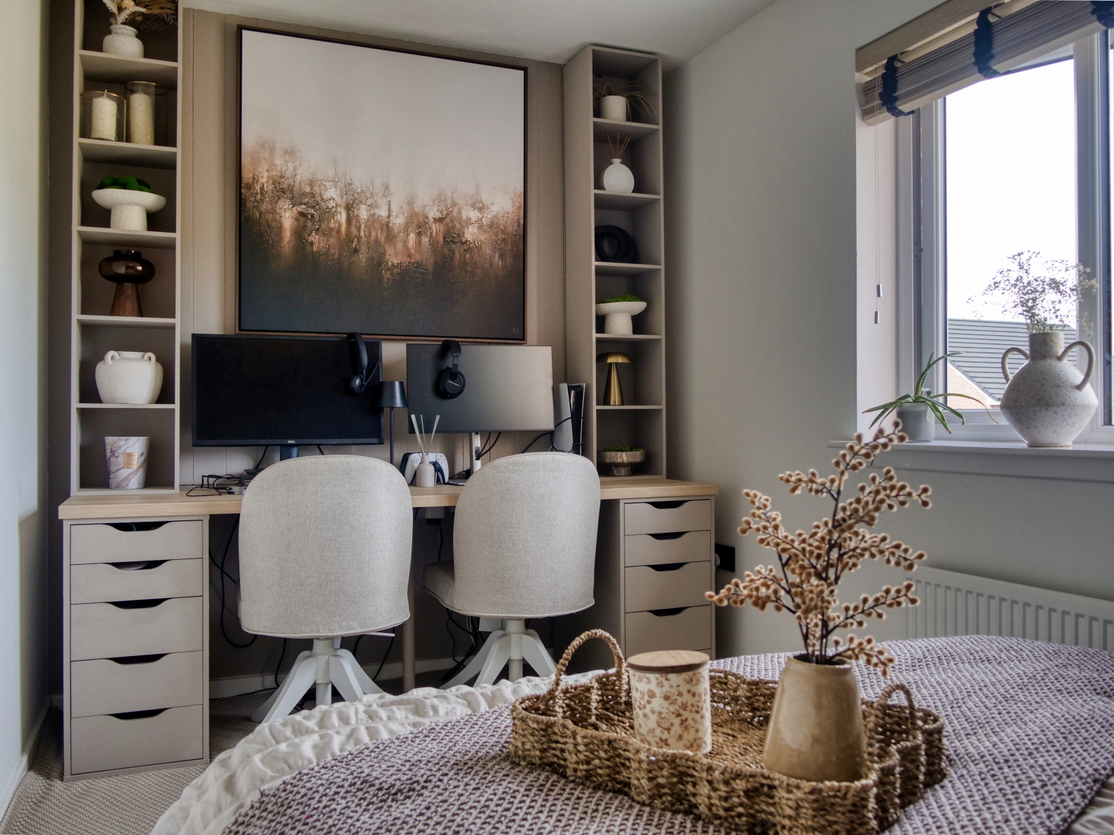 Upstairs, the hallway leads to two well-proportioned double bedrooms. One-bedroom benefits from built-in wardrobes, while the other is currently staged as a spare bedroom and home office, featuring a double work-from-home desk area. The modern family bathroom is partially tiled and comprises a wash hand basin, WC, and a bath with an overhead shower.