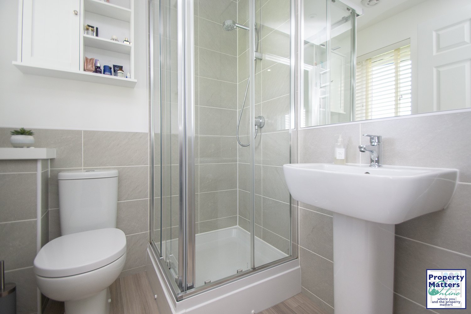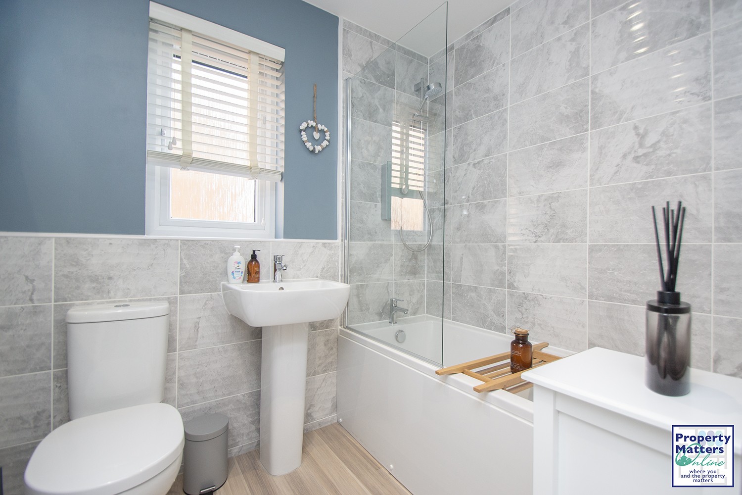 Upstairs, the primary bedroom is a generous front-facing room with large windows that flood the space with natural light. It features built-in wardrobes and an en-suite shower room, complete with a WC, wash basin, and a mixer showerss. There are two additional well-proportioned double bedrooms at the rear of the property. The family bathroom is fitted with a three-piece suite, comprising a WC, wash hand basin, and a bath with an overhead electric shower.