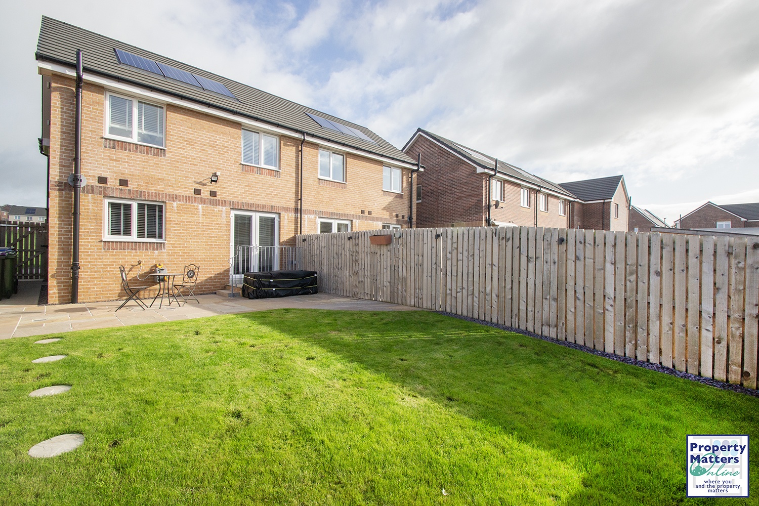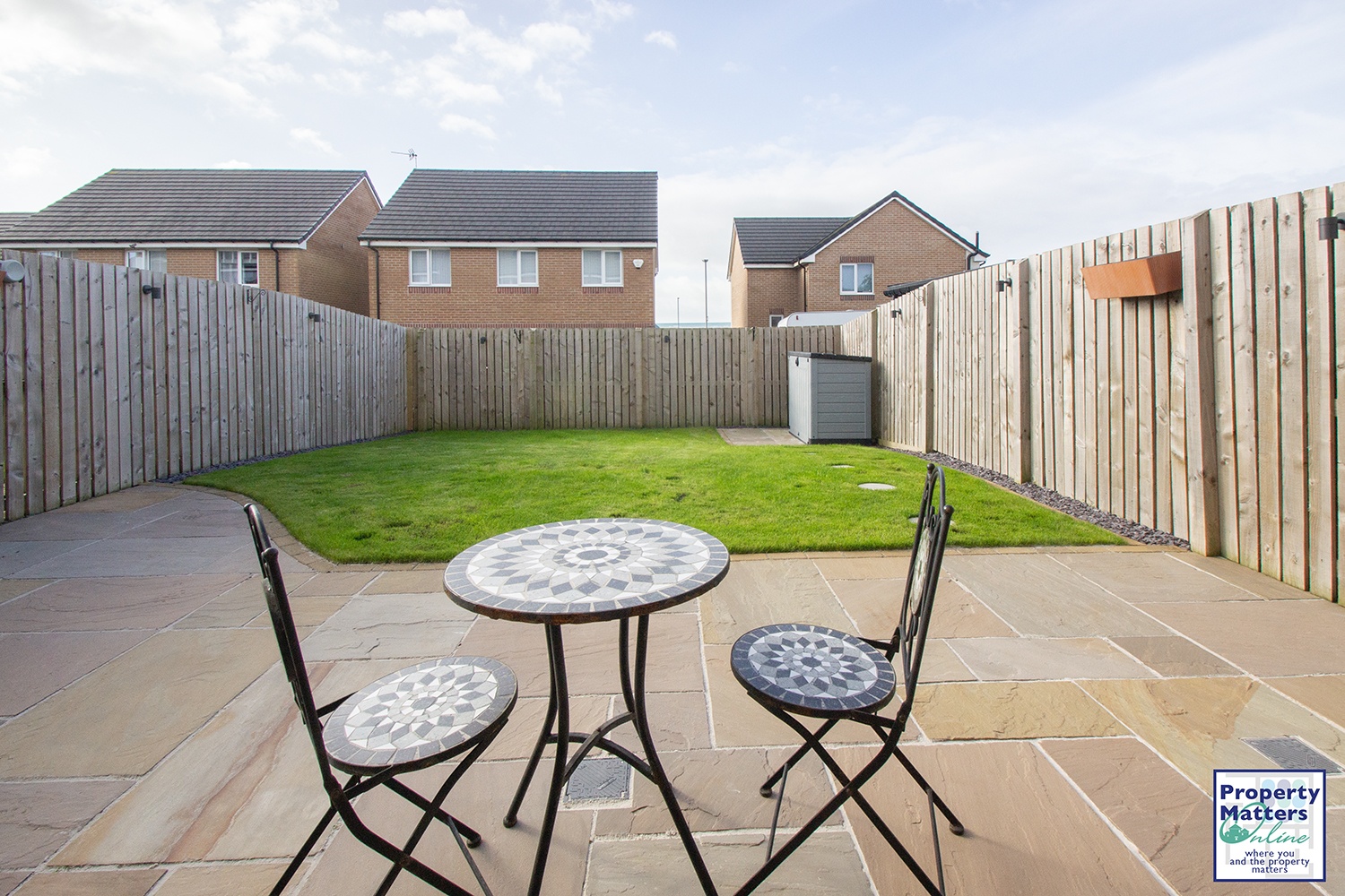 Externally, the front garden is laid to lawn with a path leading to the front door, as well as around the side of the property. There are two allocated parking spaces. To the rear, the private garden is South facing and is designed for ease of maintenance, featuring a slabbed patio area, decorative gravel borders, and a lawn, a perfect space for both relaxing and entertaining.