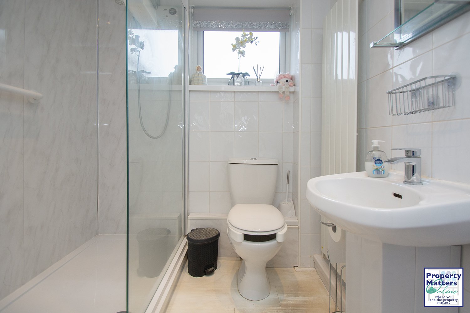 Lovely refitted shower room with 3 piece family bathroom suite comprising wc and wash hand basin and , large walk in shower with electric shower over. Modern wet wall to splashback shower areas. Rear facing opaque window. Designer radiator. UPVC clad ceiling with recessed lighting. Quality flooring.
