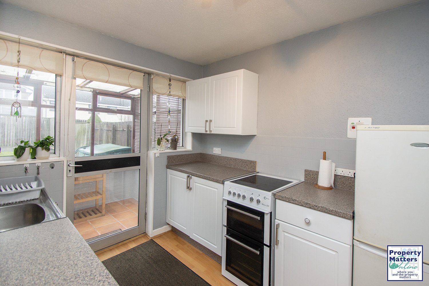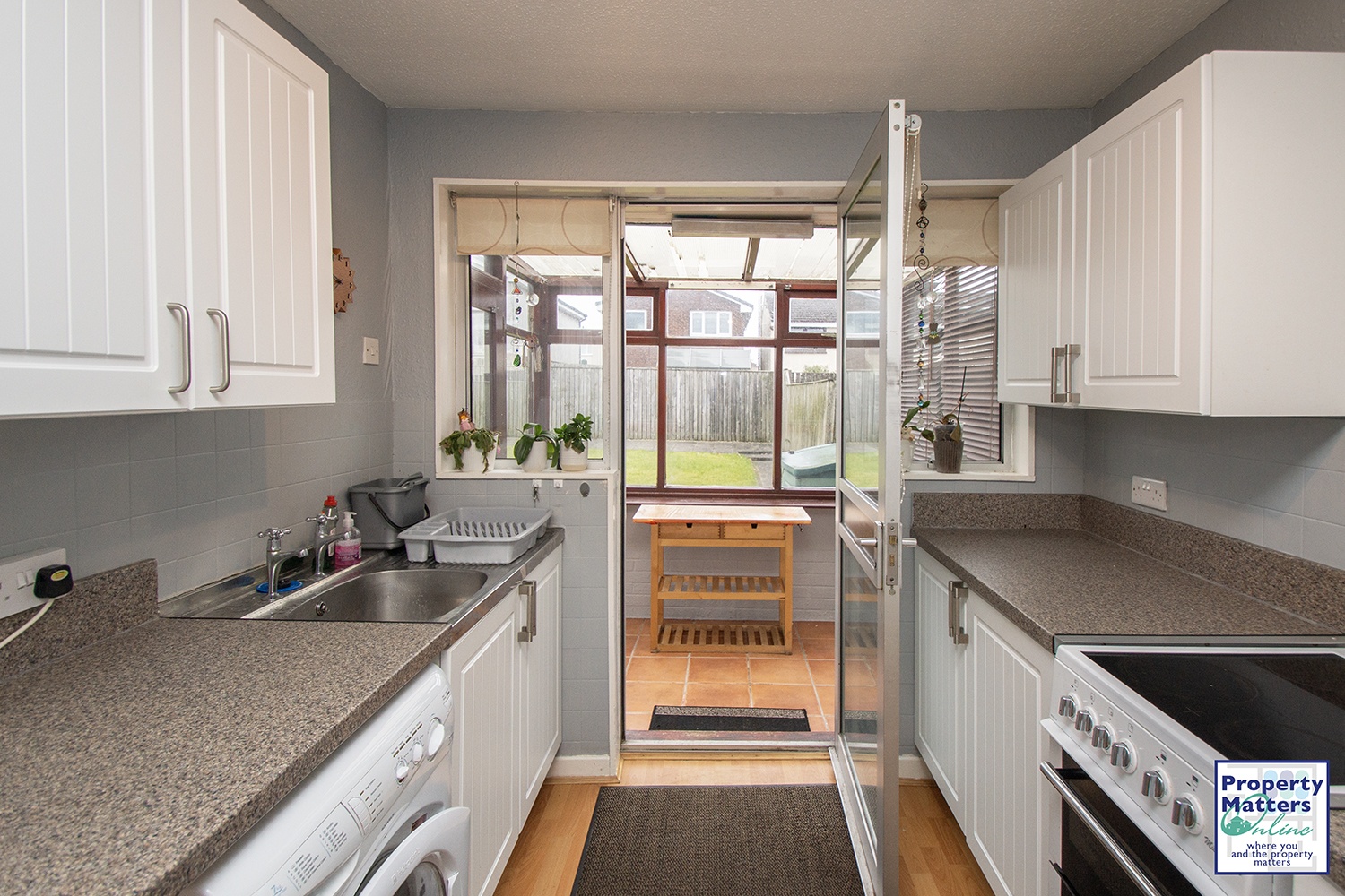 Entered from hallway into good sized rear facing kitchen with range of wall and base units in white with complimentary worktops. Inset stainless steel sink with two taps. Plumbing for automatic washing machine. Neutral décor. Ample power points. Laminate flooring. Door giving access to rear porch.