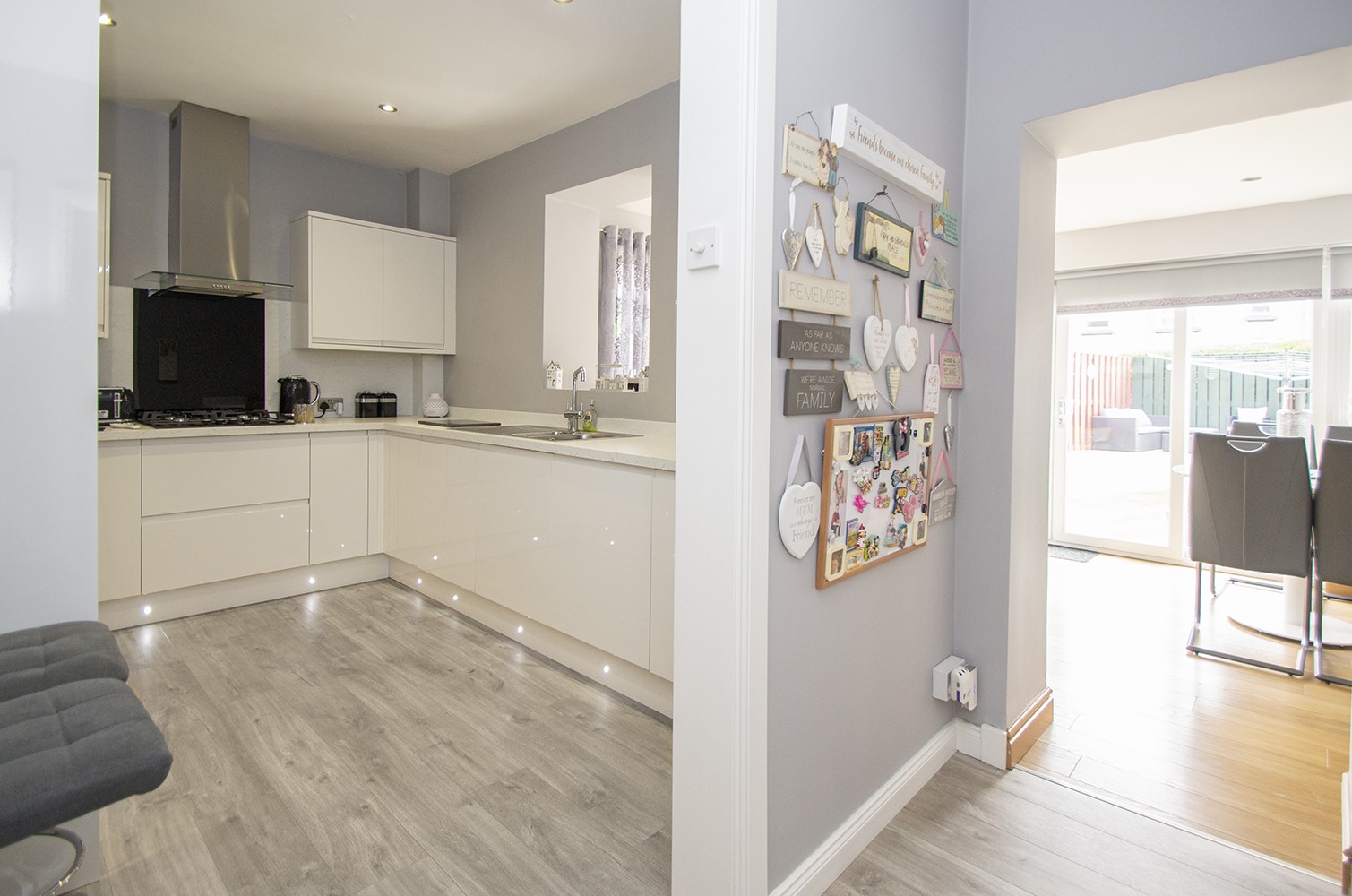This well-proportioned family home is presented in walk-in condition and has been upgraded to a high standard throughout by the current owners. The accommodation is formed over two levels, with the lower level comprising entrance hallway, bright front facing lounge with feature fire and marble effect surround. Contemporary fitted kitchen which houses an ample range of base and wall units with complementary worktops, upstands and splash-back areas, and a range of integrated appliances. Modern two-piece WC. To the rear of the property is the versatile family room/dining area with side facing windows and French door opening to the rear garden, which allows an abundance of natural light to flow through.