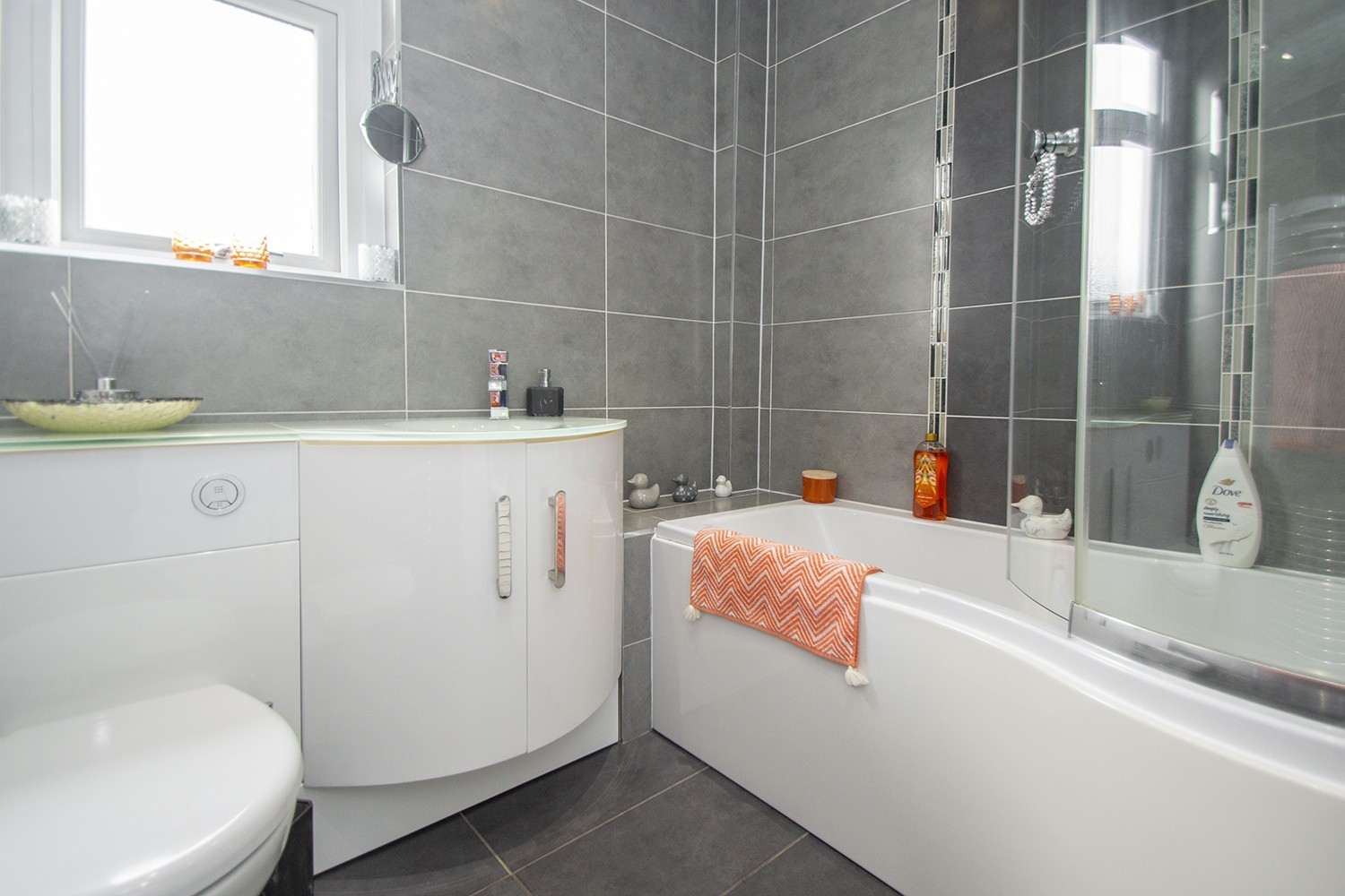 The upper-level accommodation houses the master bedroom with twin rear facing windows and bespoke fitted wardrobes. A further two well-proportioned bedrooms. Contemporary, fully tiled three-piece family bathroom comprising bath with overhead shower and vanity unit which houses the WC and wash hand basin.