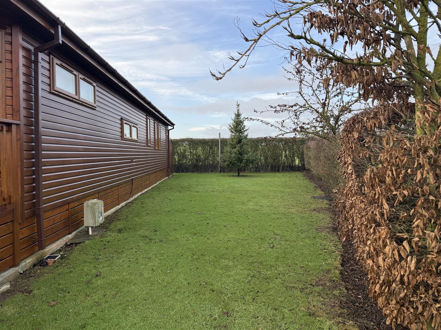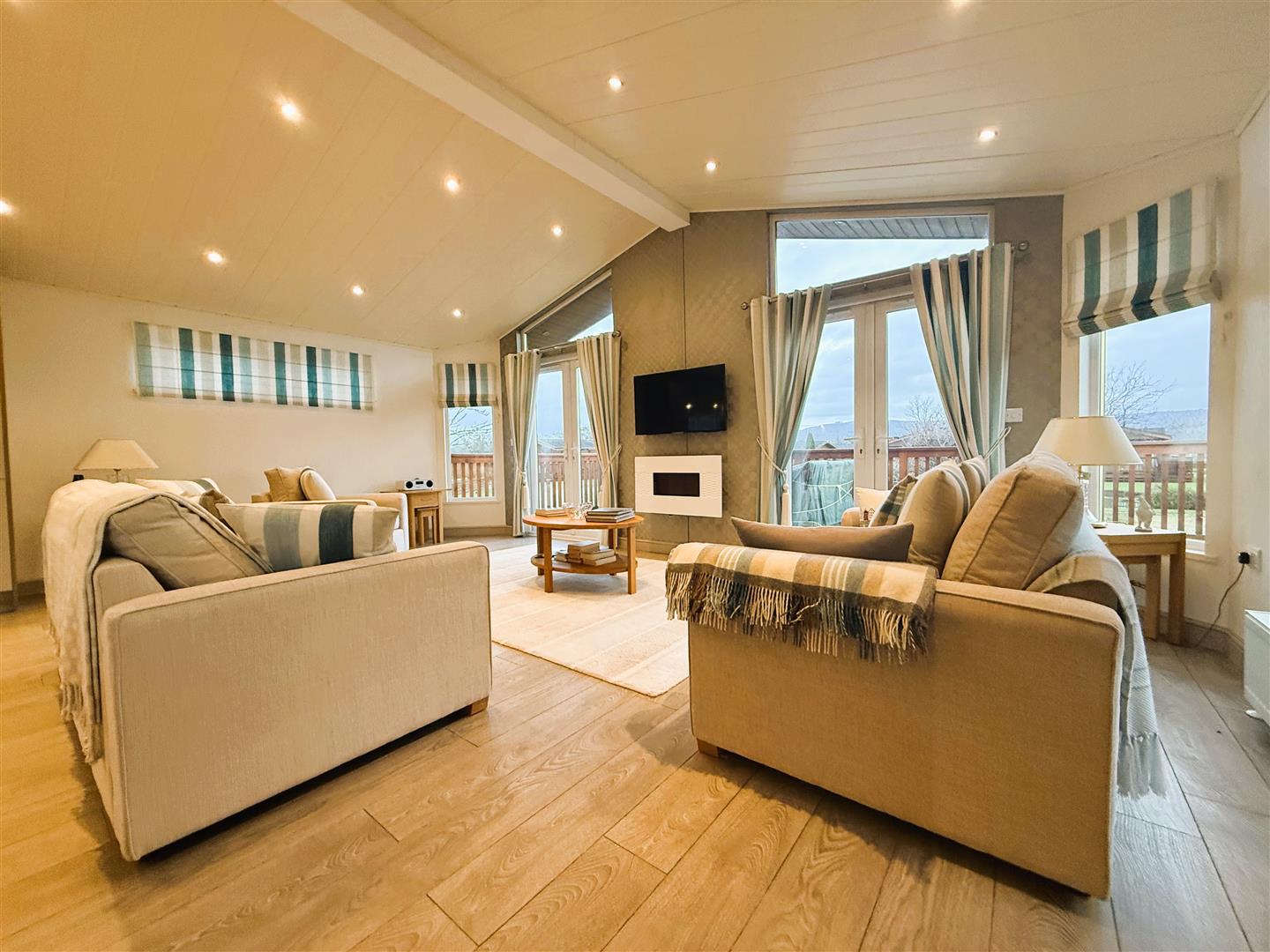 To the front of the lodge, the SITTING AREA enjoys an electric wall mounted fire and pleasant views across the green and pond.