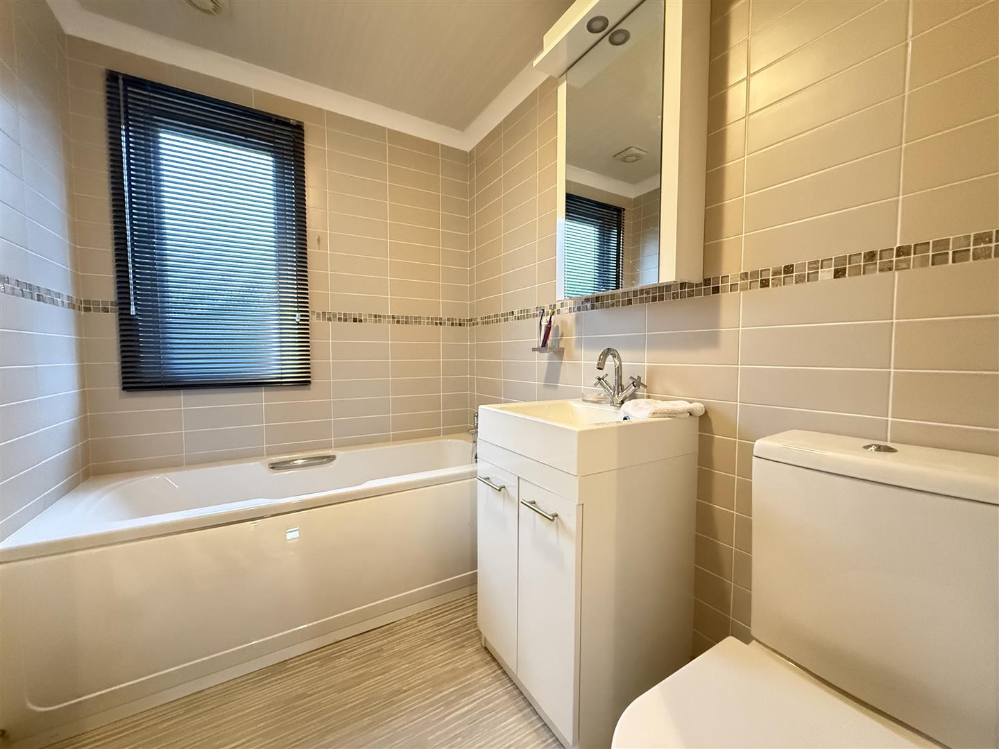 The main BATHROOM presents a contemporary white three piece suite comprising a panelled bath with chrome mixer tap, part tiled surround, frosted PVC window, low suite WC, vanity mounted wash hand basin with chrome mixer tap, mirrored cabinet and vertical chrome towel radiator.