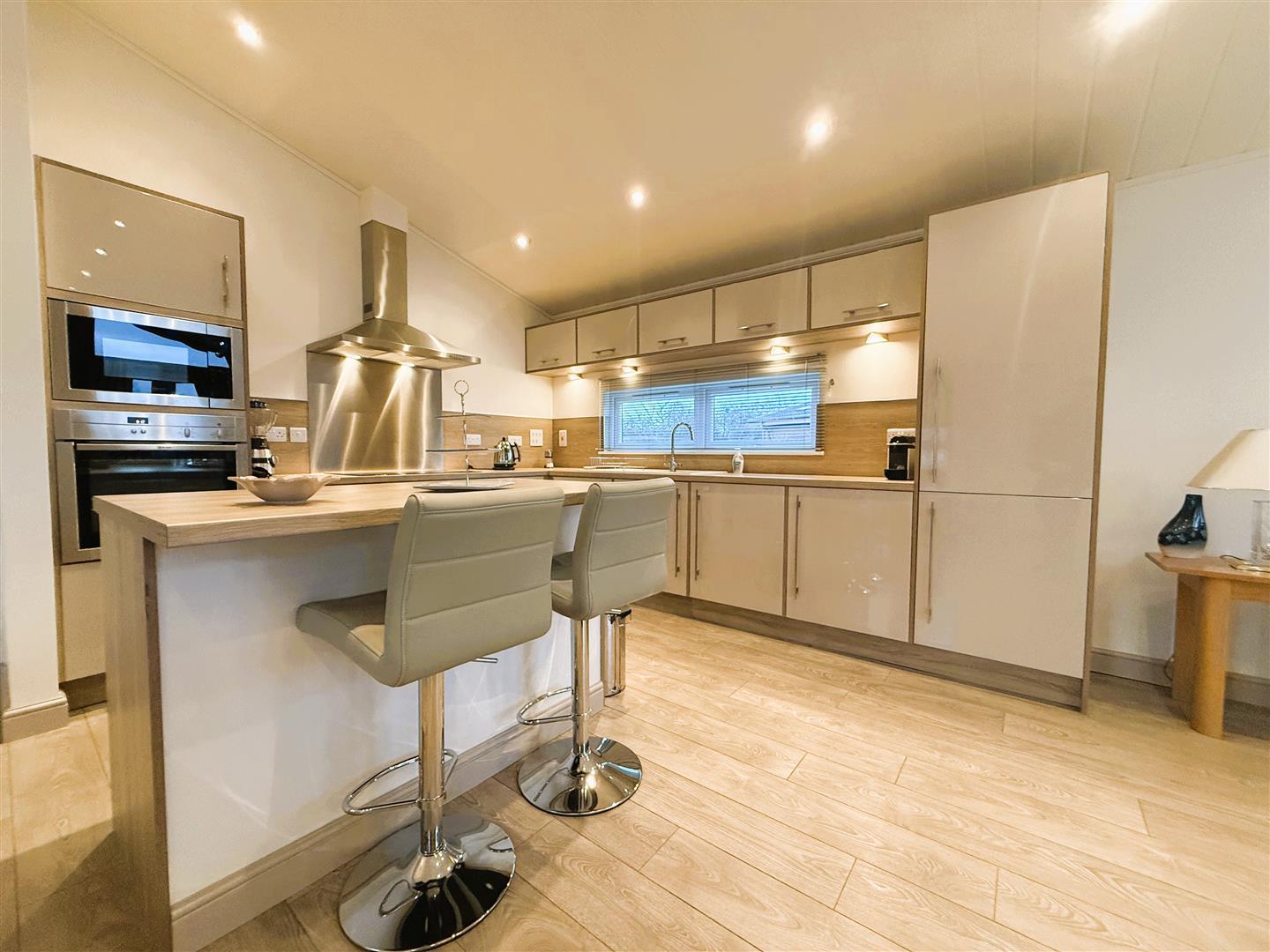 To one side, the kitchen BREAKFAST AREA features an island with matching oak effect worktop, storage and an extended breakfast bar for informal dining.