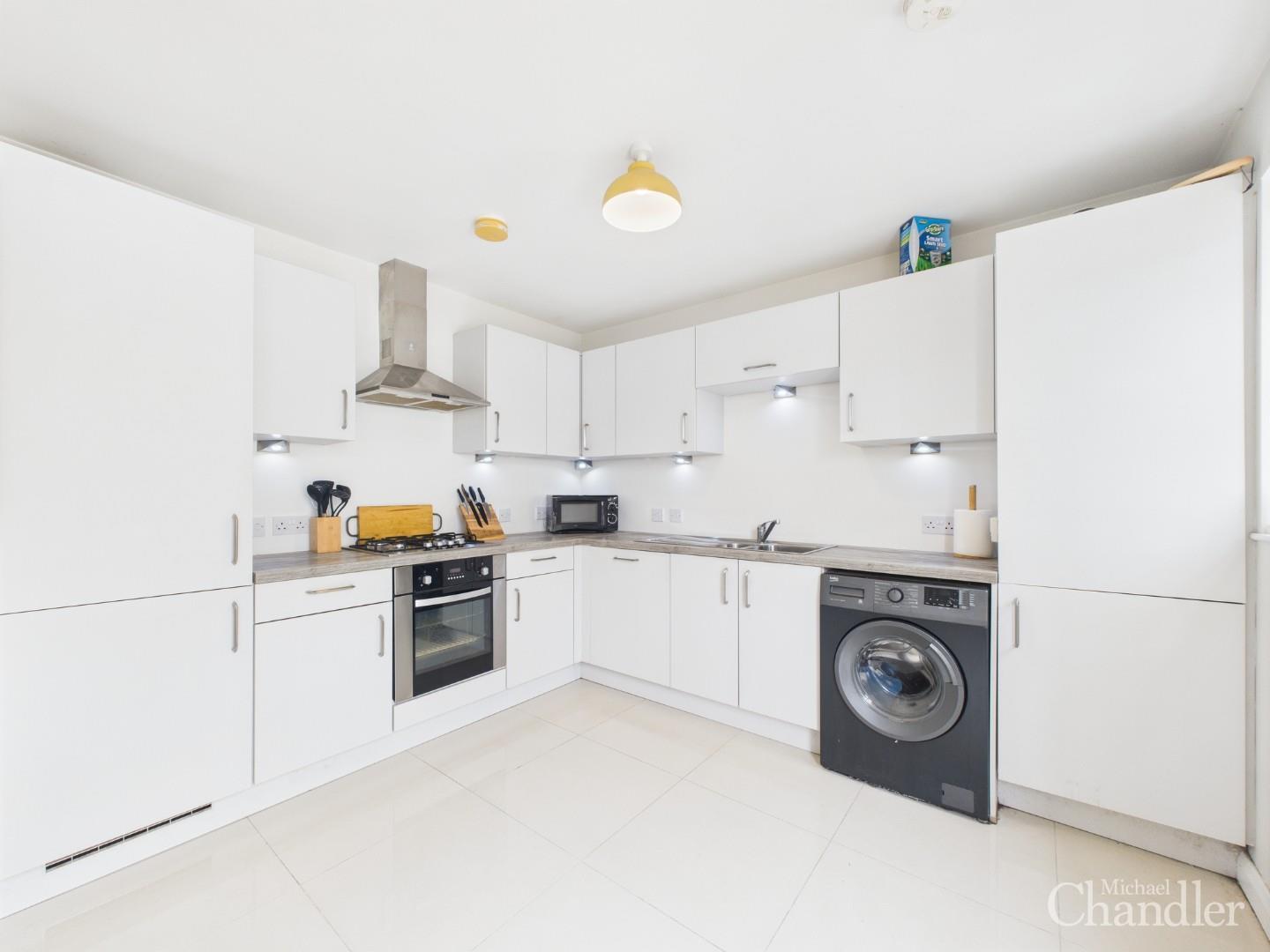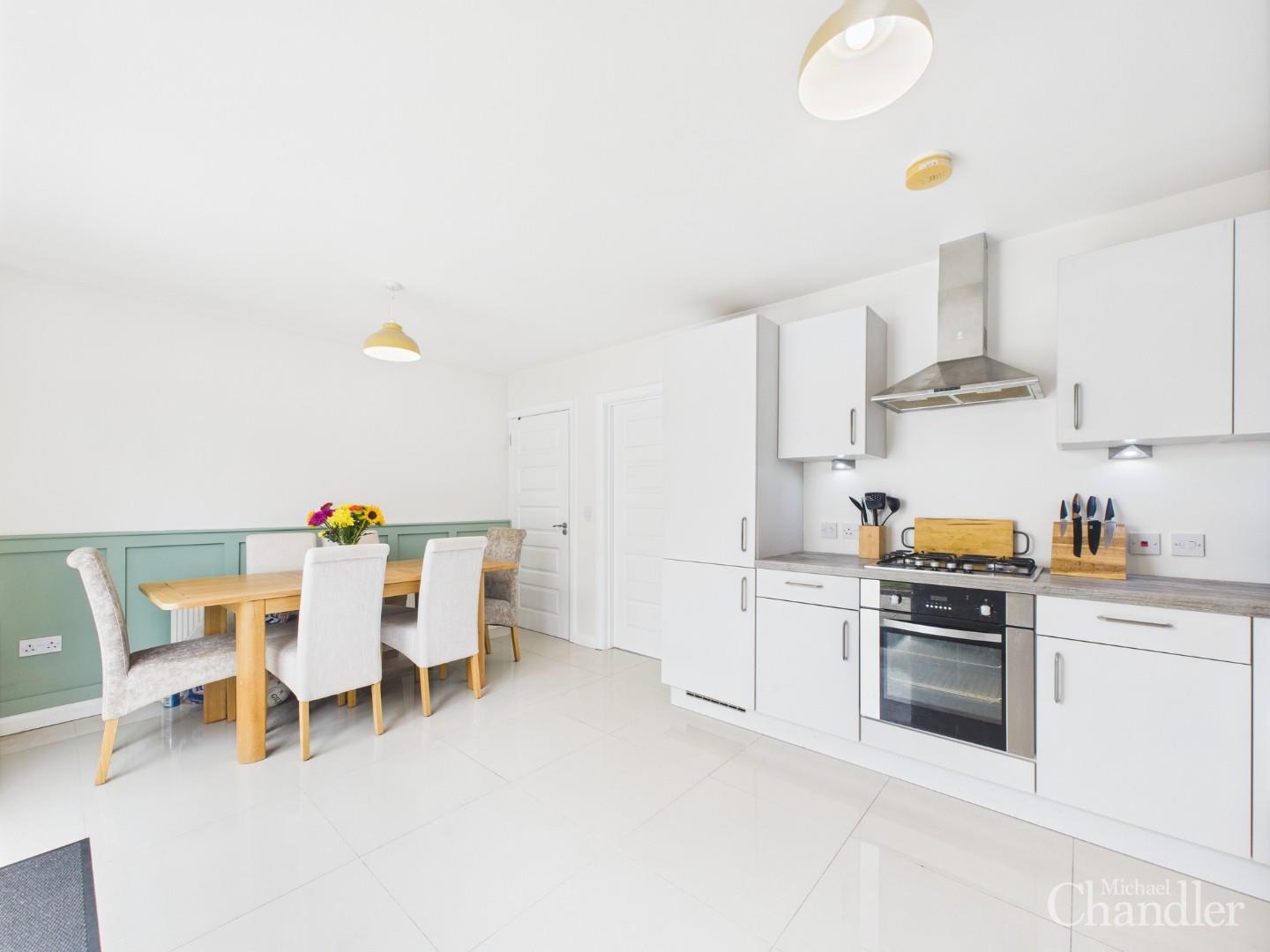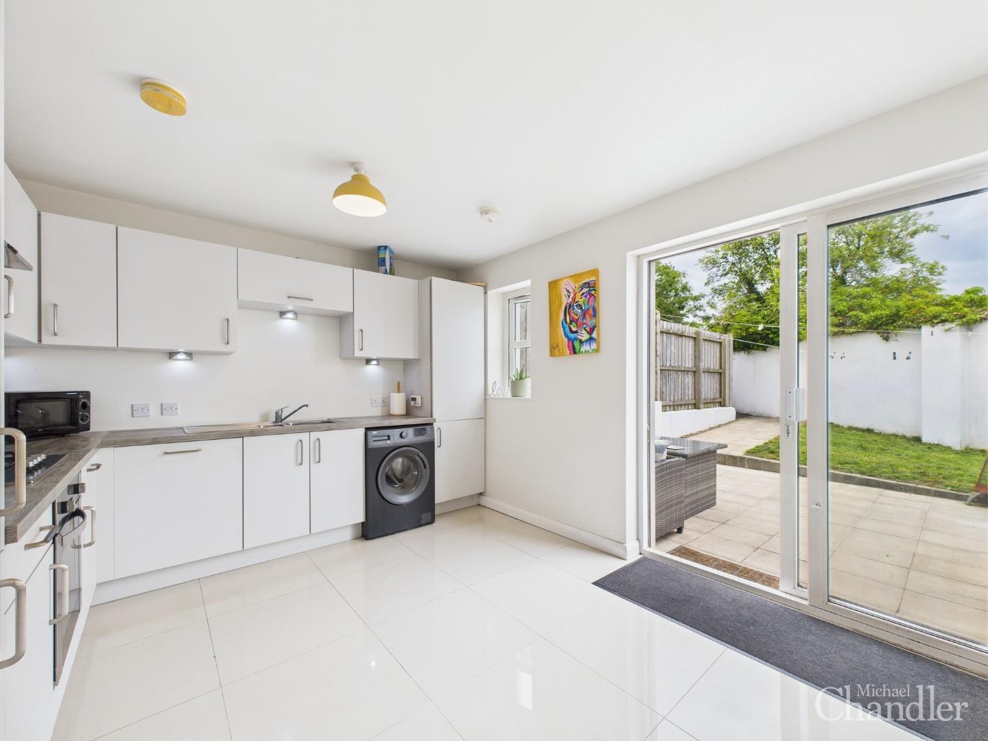 Modern kitchen benefits from open plan dining and patio doors to the rear garden