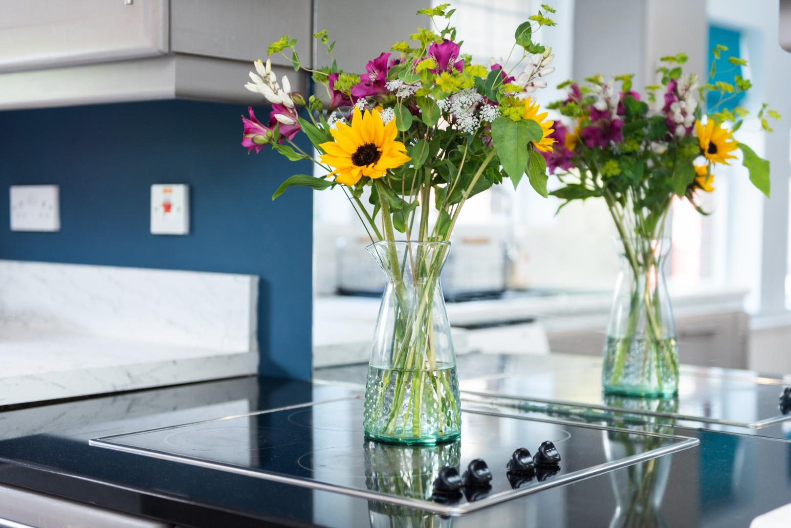 A modern fitted kitchen with range of integrated appliances and space for American style fridge