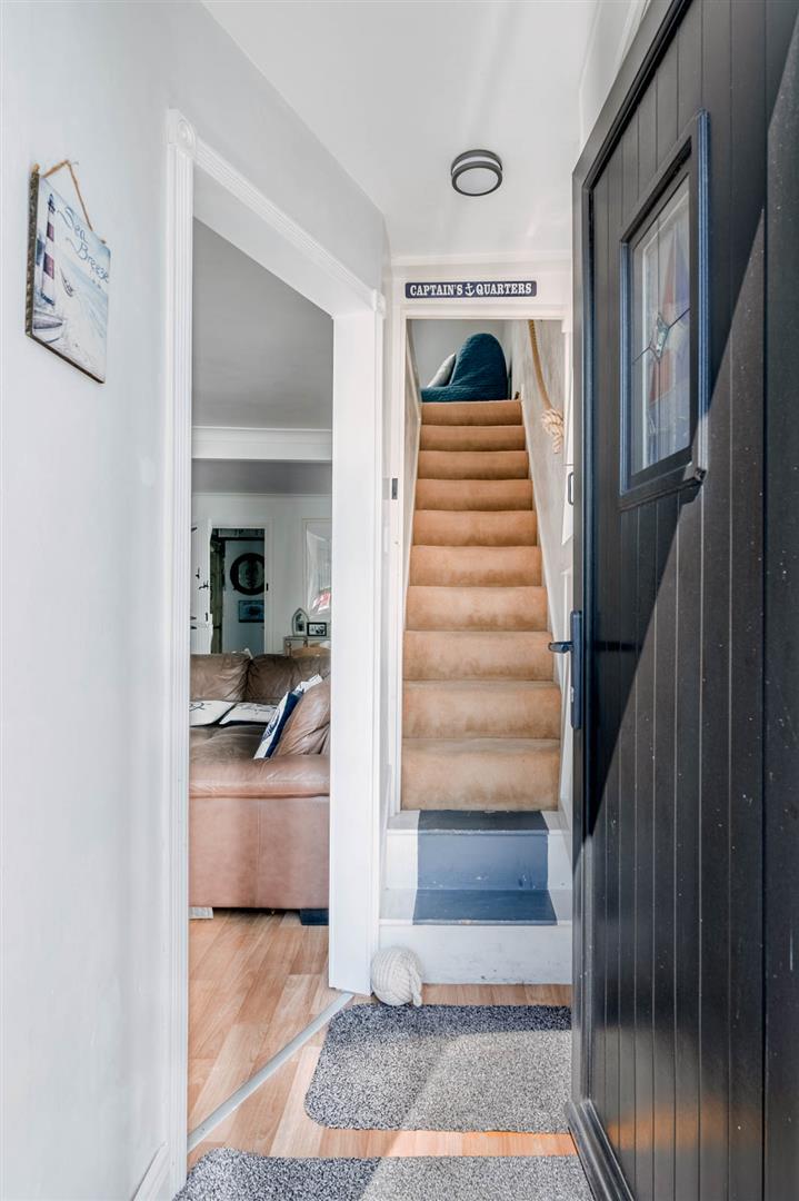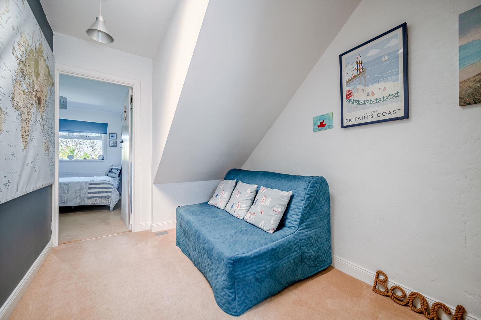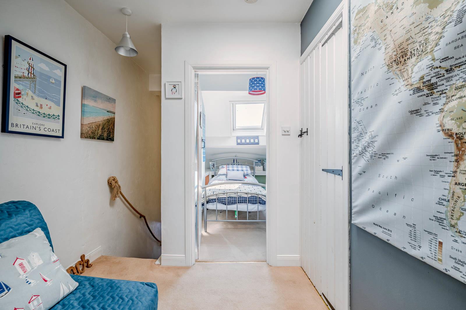 Upstairs, the home continues to impress with two well-proportioned bedrooms offering comfort and tranquility, while the beautifully appointed bathroom features a shower and high-end fittings, bringing a touch of luxury to everyday routines. Large windows throughout ensure each room feels bright and airy.