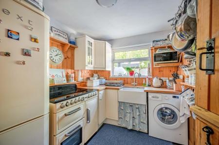 Kitchen: - (2.18m x 2.51m) - Modern range of high and low level units, wooden work surface, belfast sink with mixer tap, range cooker and fridge/freezer.