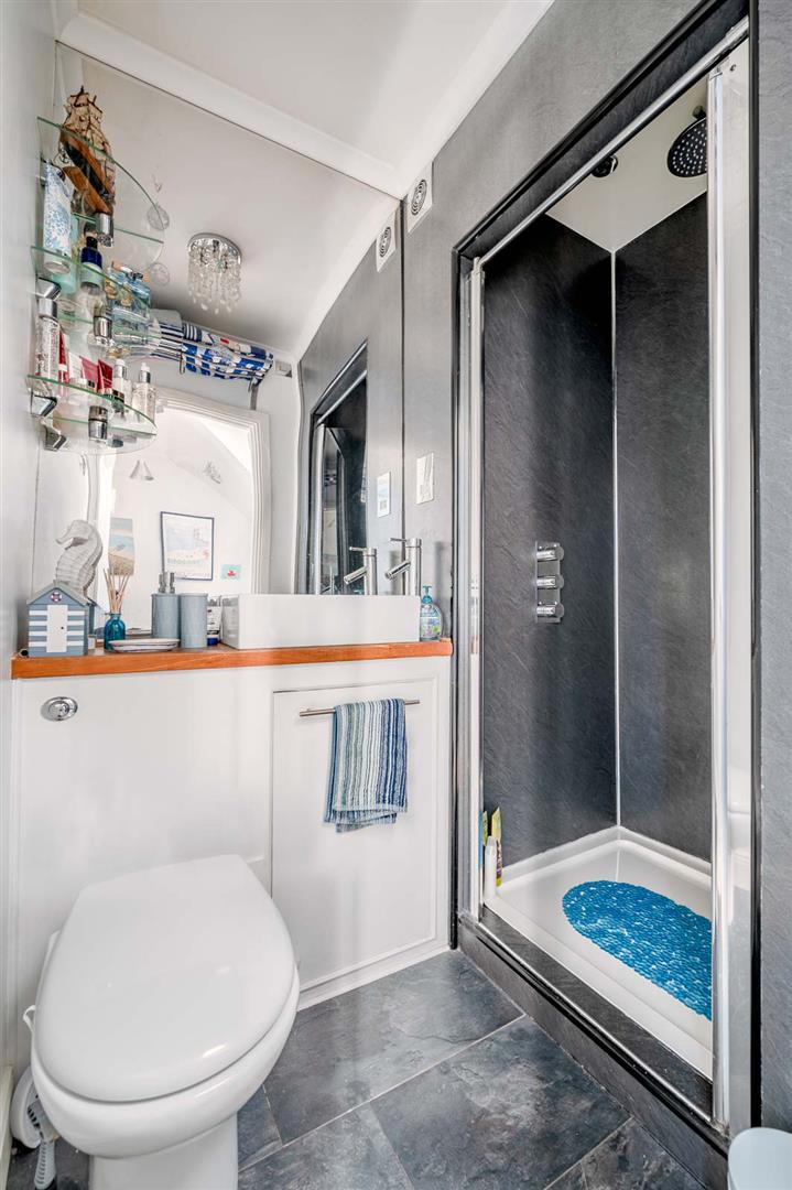 Bathroom: - () - Modern white suite comprising of a shower, wash hand basin, low flush wc and wooden laminate flooring.