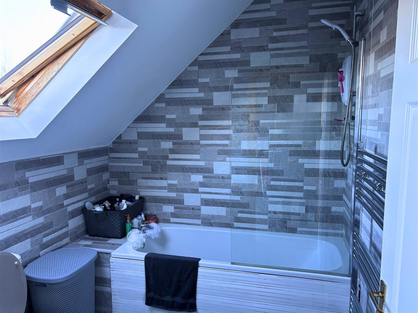 Bathroom: - 2.3 x 2.1 (7'6" x 6'10") - with three piece suite comprising of fitted bath with electric shower overhead, pedestal wash hand basin, low flush w.c. Also having extractor fan, stainless steel room heater, Velux window, fully tiled walls, tiled flooring.