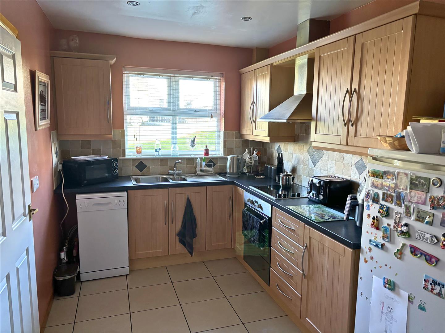 Kitchen: - 4.5 x 2.3 (14'9" x 7'6") - with a range of modern eye and low level units, matching worktop, tiled around units, stainless steel sink unit, built-in hob and oven, stainless steel extractor fan with light, space for fridge/freezer, plumbed for dishwasher, recess low voltage down-lighters, tiled flooring.