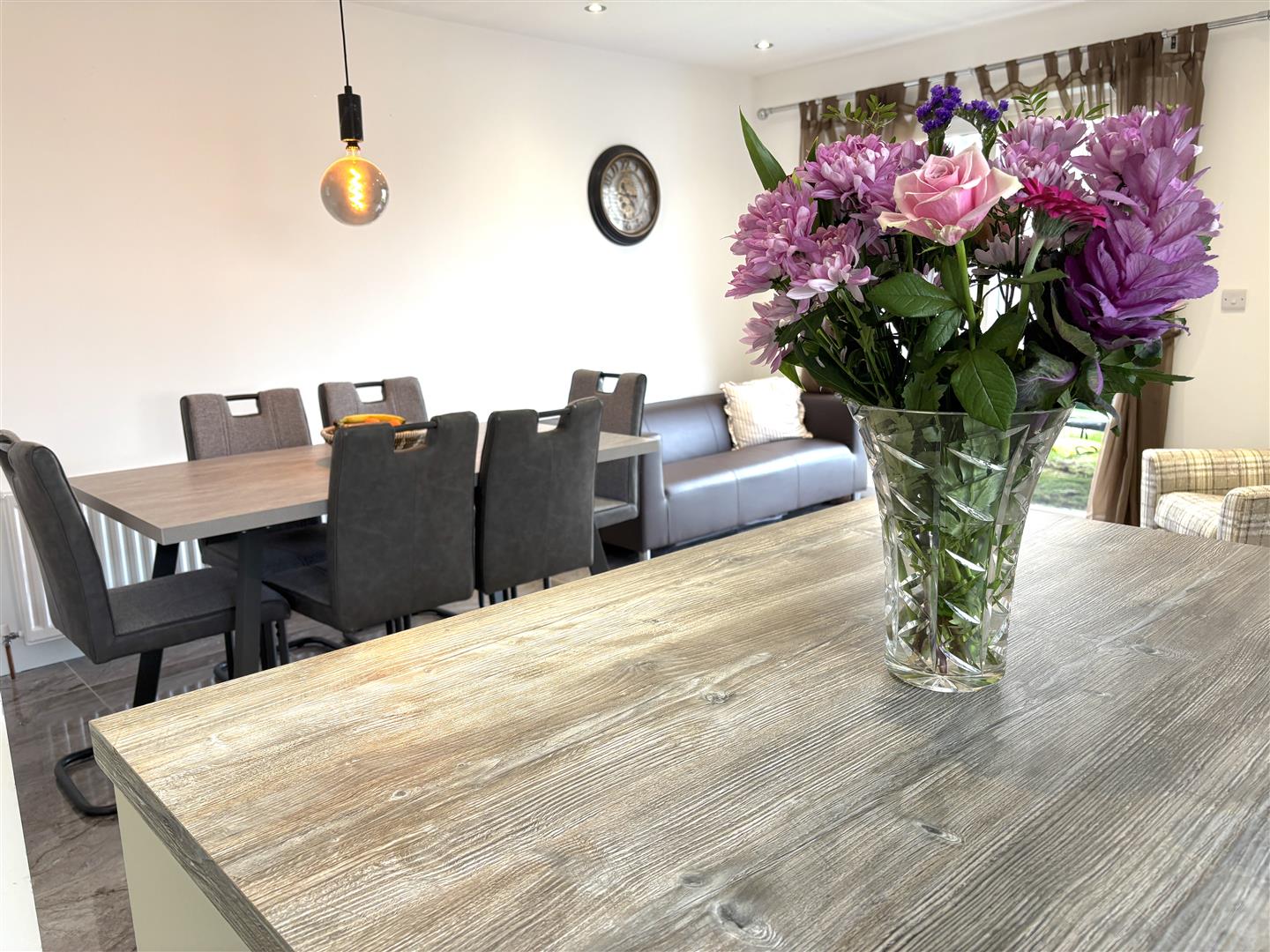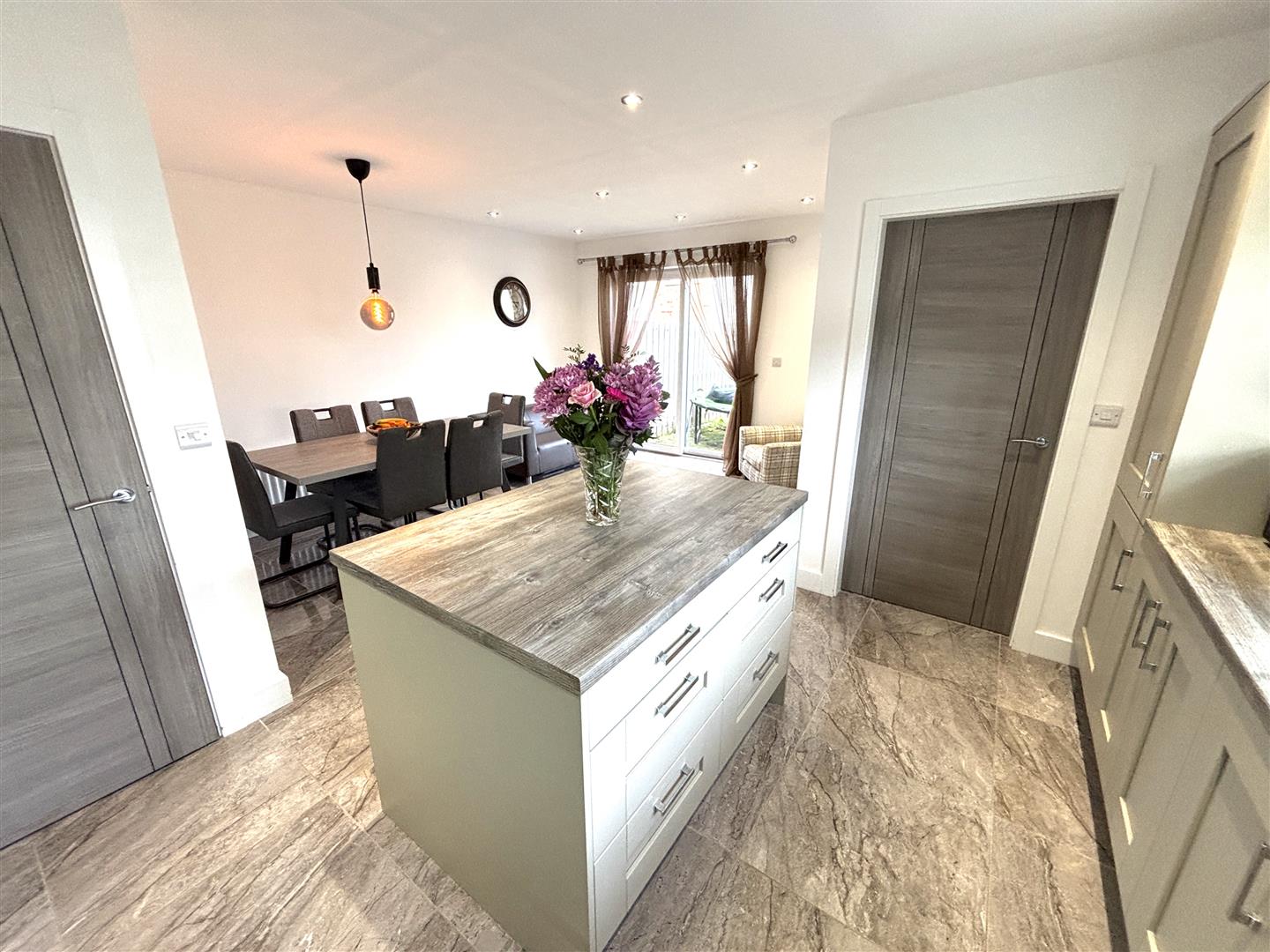 Kitchen: - 6.1 x 5.0 (at widest points) (20'0" x 16'4" (at wi - Fitted with a range of eye and low level units with matching worktop. Under unit lighting. Stainless steel sink unit. Built in hob and oven. Extractor fan and light. Plumbed for automatic dishwasher. Centre island. Tiled flooring. PVC patio doors to enclosed rear garden.