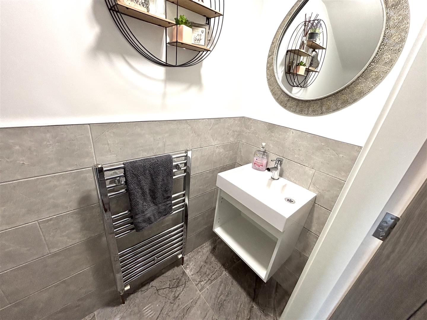 Separate W.C. - Consisting of a Low Flush W.C., wall mounted wash hand basin and extractor fan. Chrome heated towel rail. Tiled flooring and part tiled walls.