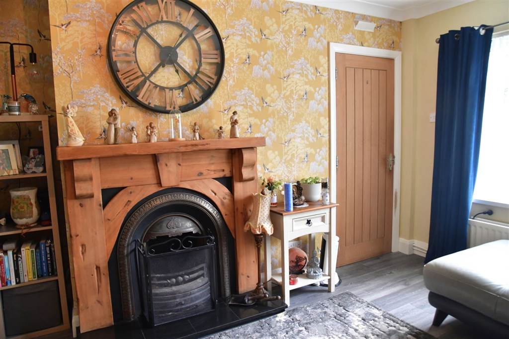 - Living room with cast-iron fireplace