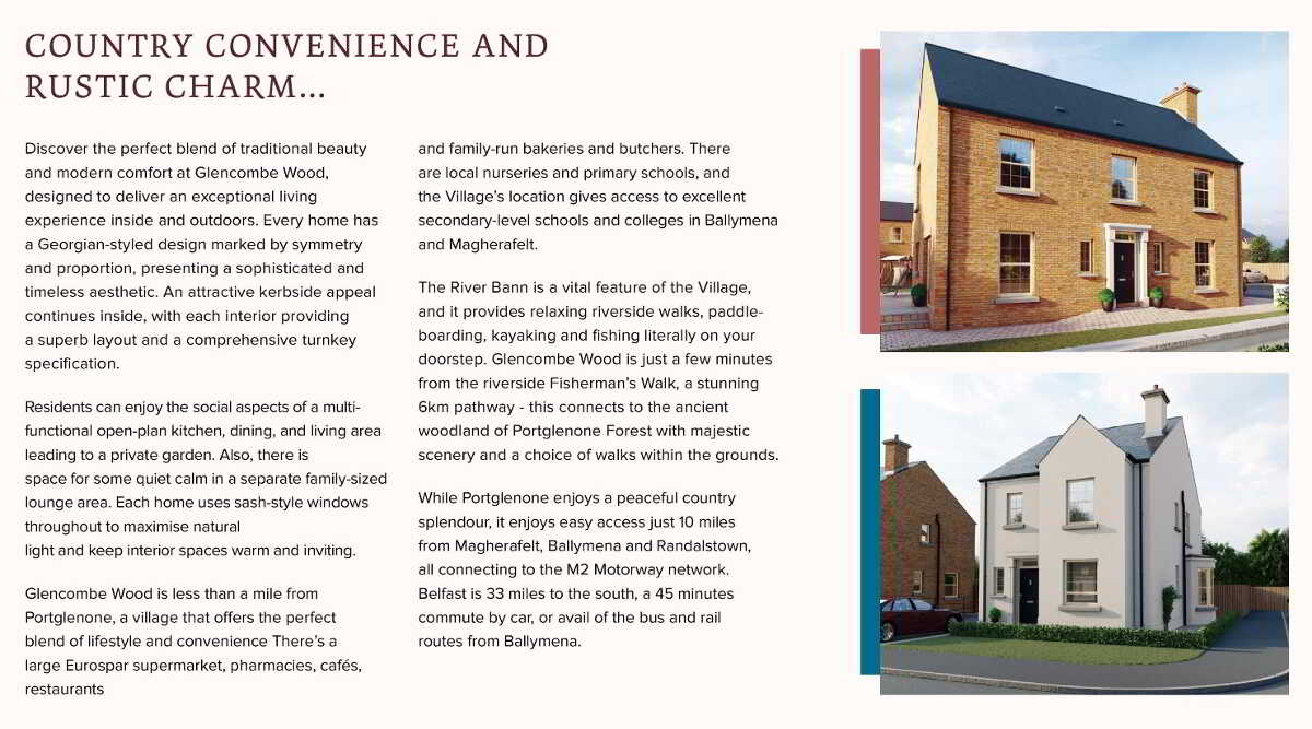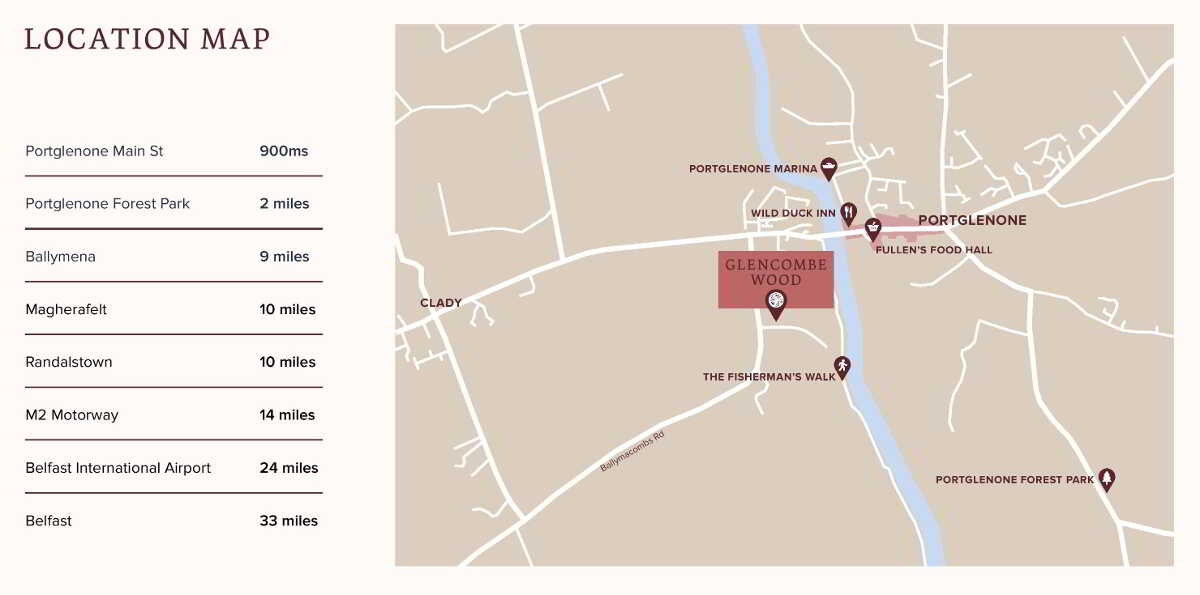Glencombe Wood is less than a mile from Portglenone, a village that offers the perfect blend of lifestyle and convenience There’s a large Eurospar supermarket, pharmacies, cafés, restaurants and family-run bakeries and butchers. There are local nurseries and primary schools, and the Village’s location gives access to excellent secondary-level schools and colleges in Ballymena and Magherafelt.