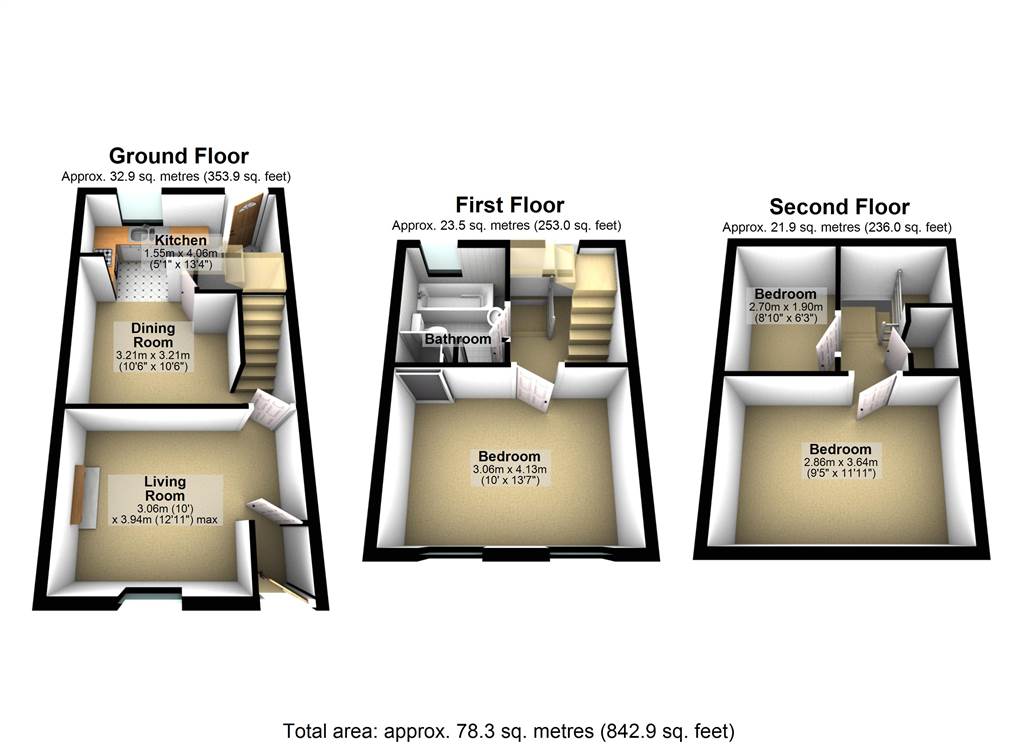 - Three bedrooms (two on second floor)