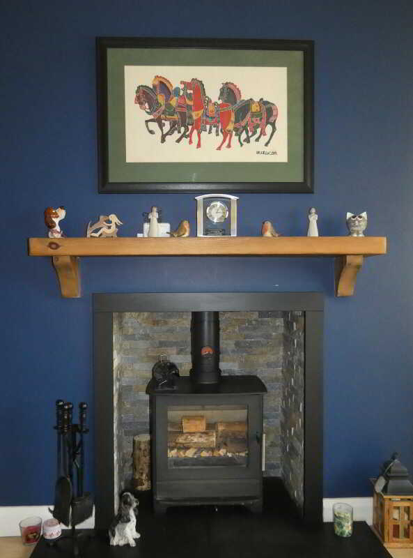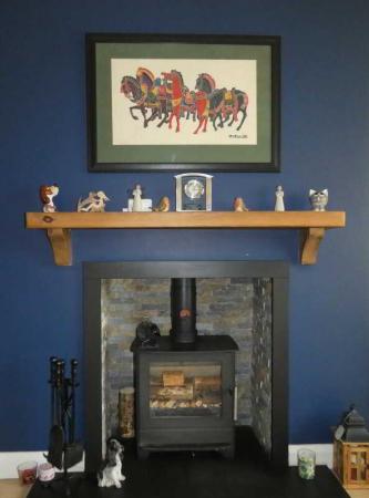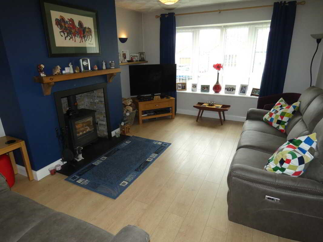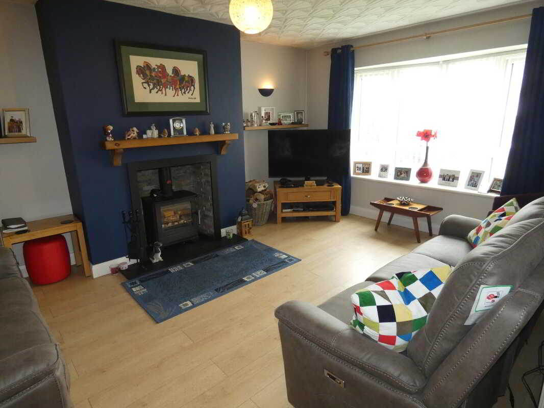 - Lounge with an inset multi fuel stove and an open outlook to the front.