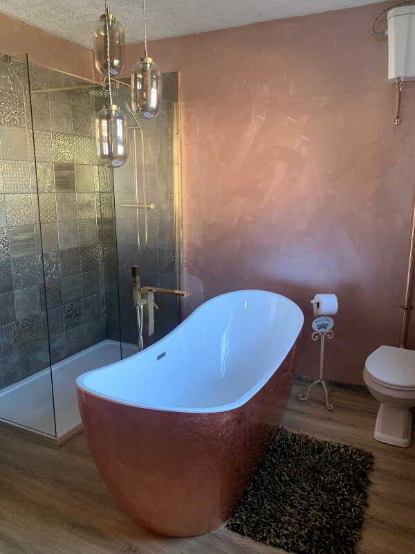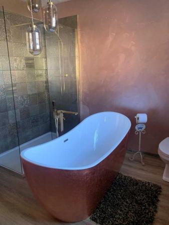 - The same including the feature free standing copper effect bath, brass effect vanity unit and a large shower in contemporary tiling.