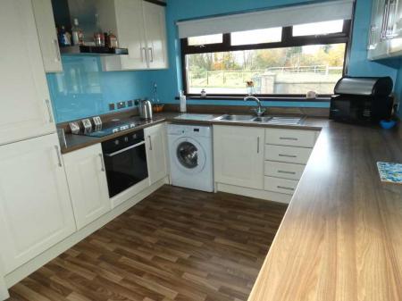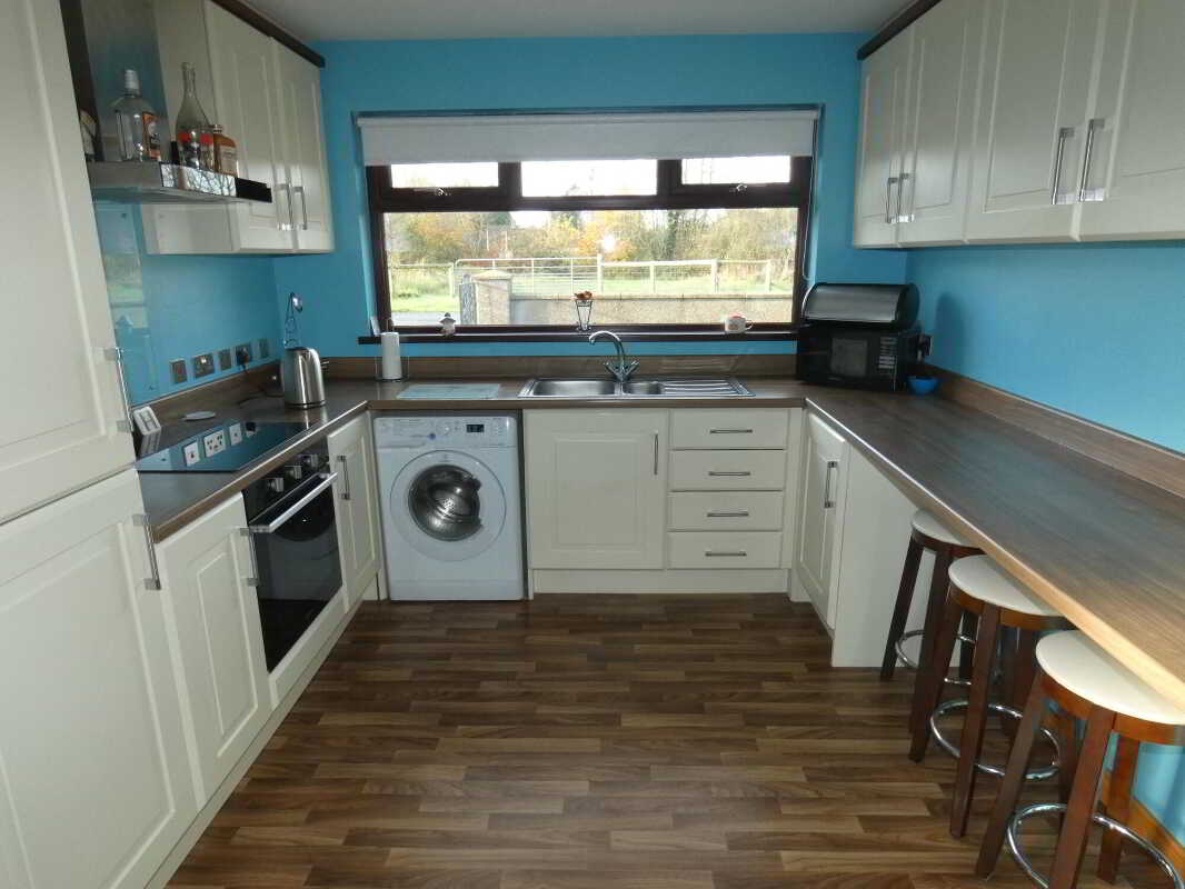 - Attractive kitchen with integrated appliances and a breakfast bar seating area.
