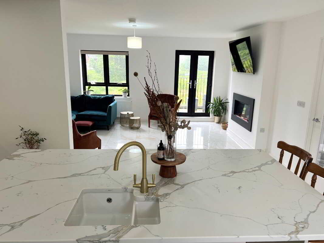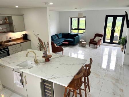 - The property also has a feature kitchen/dinette which is open plan to a lounge/living area with balcony (overlooking the open space, the river and the river bridge).