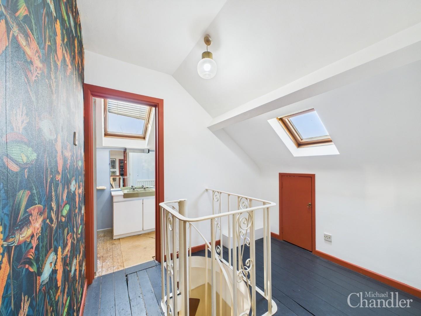 Spiral staircase leading to a large bedroom and a bathroom (currently disconnected)