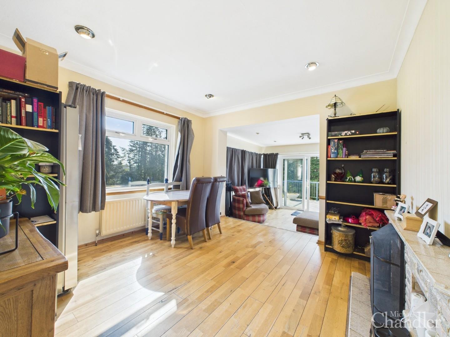 Delightful lounge with an open fire and steps to a dining area with lovely views