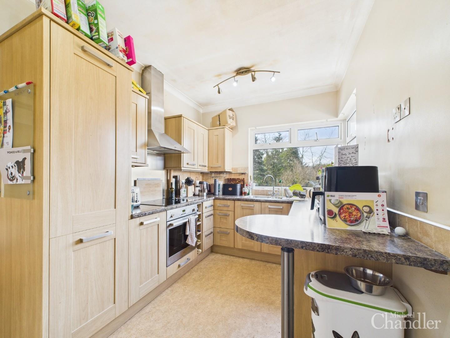 A modern kitchen with dual aspect windows and complete with built in appliances