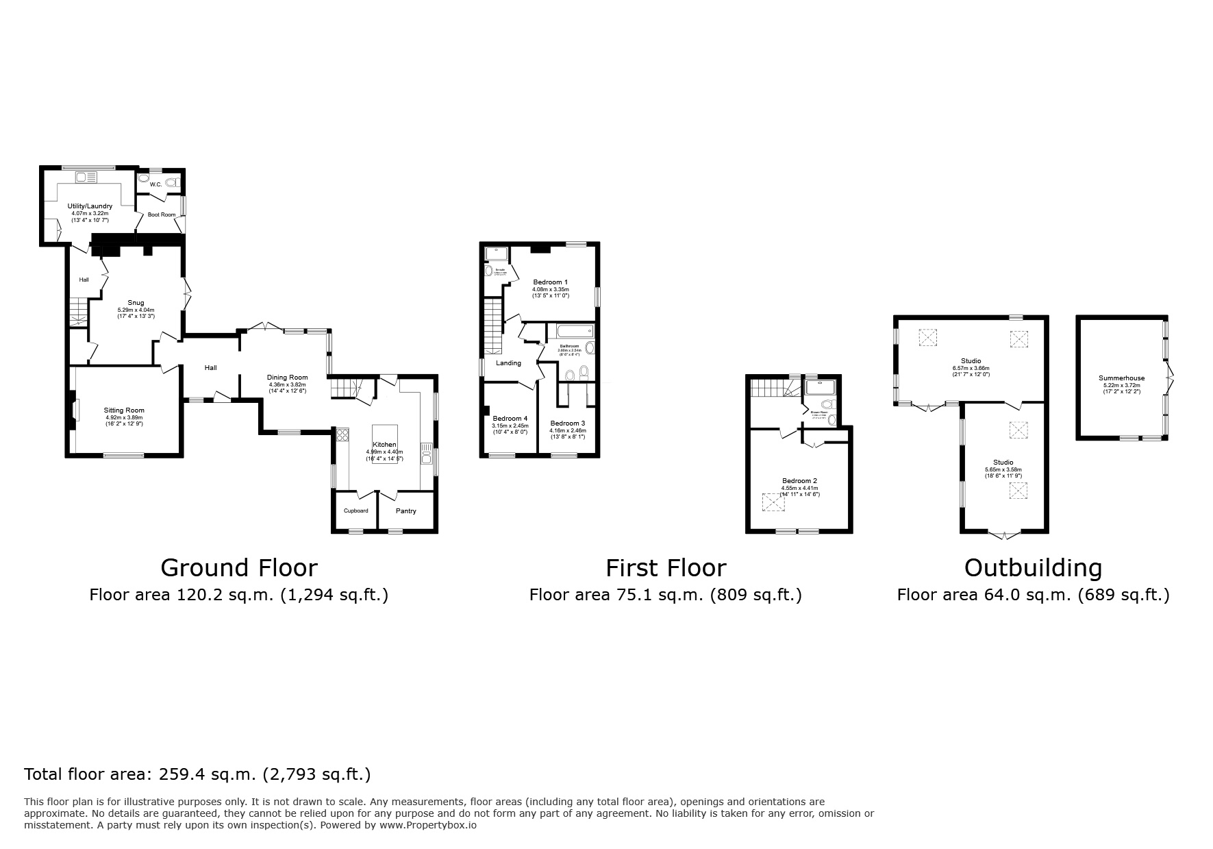 - Separate summerhouse and extensive larch-clad workshops/studios with power and decked terrace, with workshop/studio offering potential for further uses, subject to planning