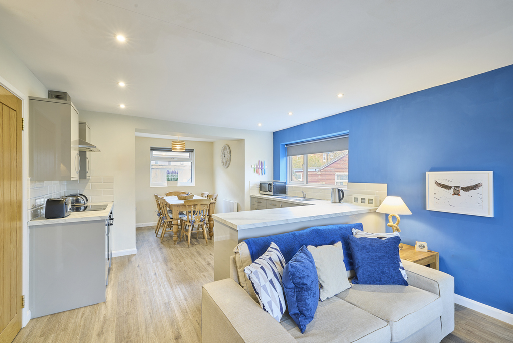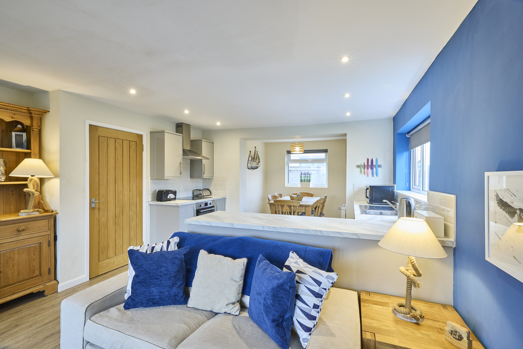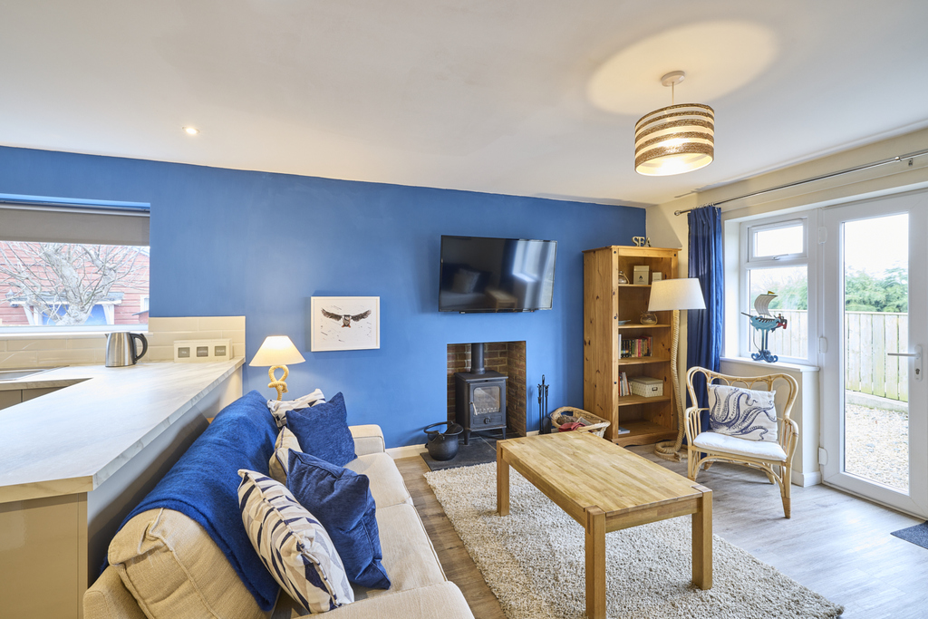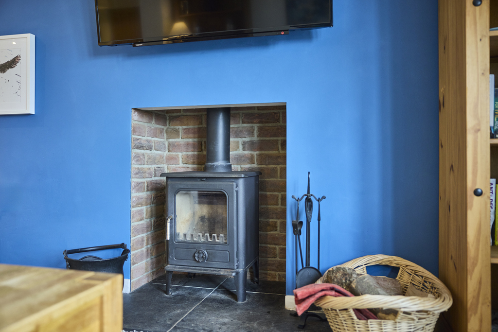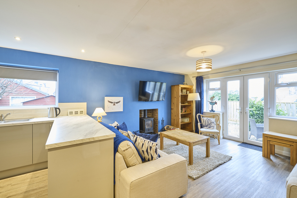 Capturing glorious garden views, the lounge-kitchen-diner is a superb open plan space with French doors leading into the garden and two further windows allowing a wealth of natural light to circulate. There is plenty of space to sit and dine, and the kitchen offers a good number of wall and base units with a grey door complemented by a light grey marble-effect work surface and natural-toned brick-style splashback tiling. In terms of fitted equipment, there is a slimline dishwasher, a single bowl stainless steel sink, an under-bench fridge, an under-bench freezer, and an electric oven beneath a four-burner induction hob and a chimney style extractor fan. Ceiling spotlights add to the natural light. The living room area is comfortable and, through the French doors, captures views of the garden extending to the fields beyond. The inglenook fireplace incorporating a wood burner is a pleasant focal point enticing you to sit before it during the cooler months.