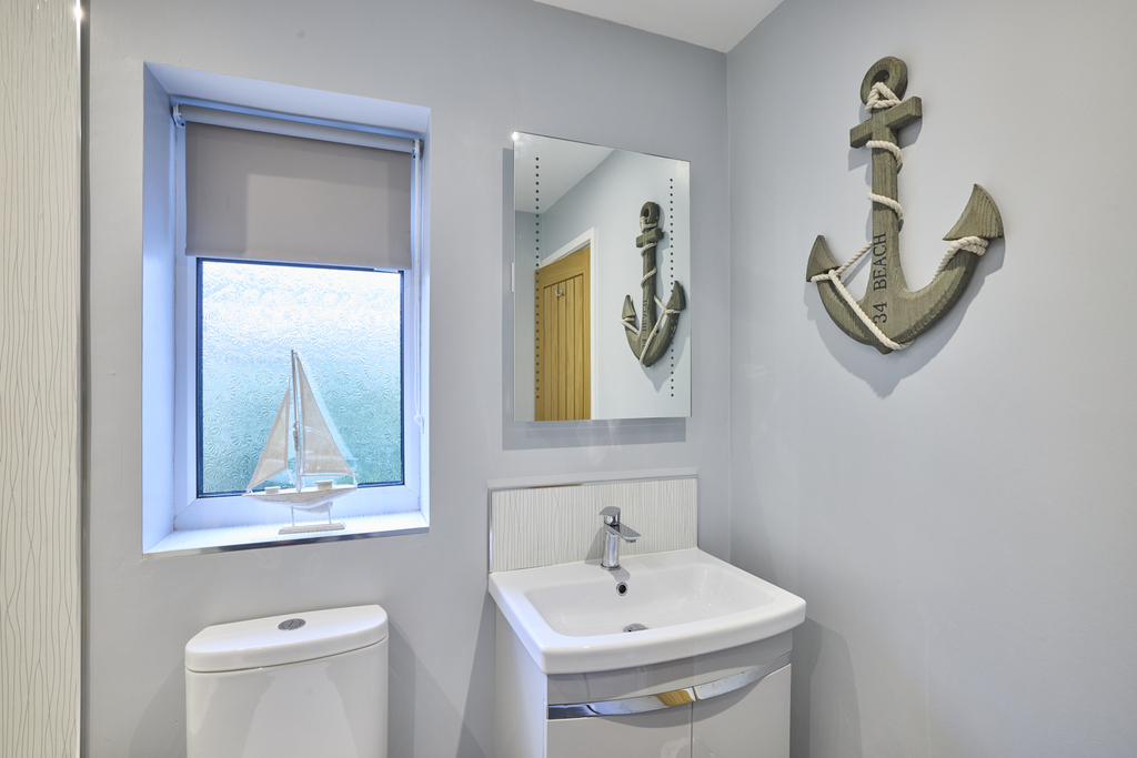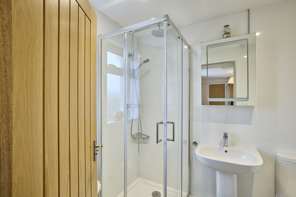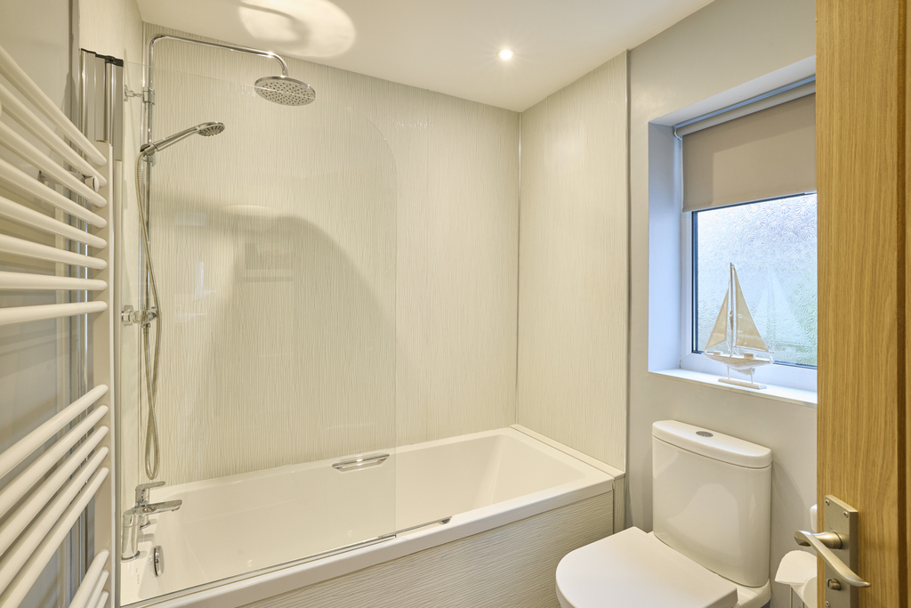 The primary bedroom, with loft access, is a large double room with window overlooking the surrounding fields. Neutrally decorated allowing the easy addition of accent colour should you so wish and finished with a sumptuous carpet, this is a lovely relaxing space. The en-suite, benefiting from a useful storage cupboard, comprises a corner shower cubicle with waterfall shower head and a separate shower head within, a pedestal wash hand basin, a close coupled toilet with a push button and a white heated towel rail ensures added comfort. The space is fully wet walled and finished with grey vinyl flooring. A window allows for natural light.