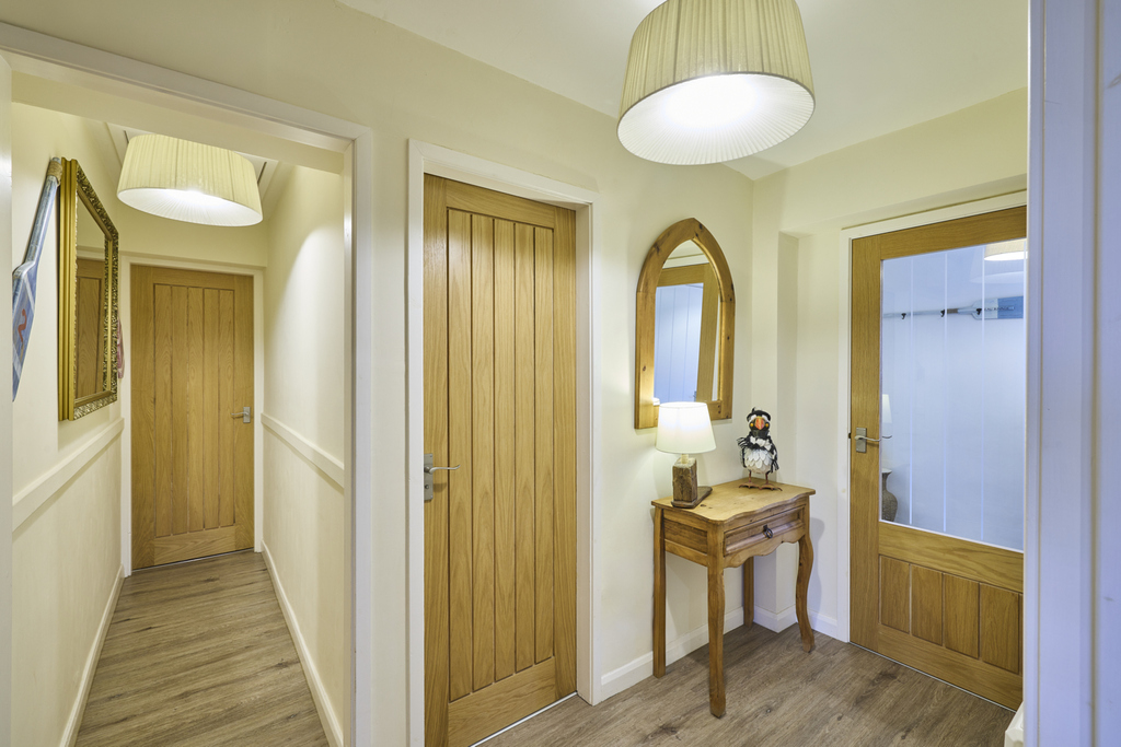 A path, with a small garden to one side, leads to the front door which opens into a light and bright internal porch offering a useful cupboard ideal for the storage of coats and shoes, and there is space for an appliance such as a tumble dryer if you so wished. A window allows for natural light and the space is neutrally decorated. An oak and glass door opens into the main hallway which provides convenient access to the principal living areas. The space is finished with stylish wood-effect LVT flooring which extends throughout most of the ground floor creating a seamless transition between the different spaces.