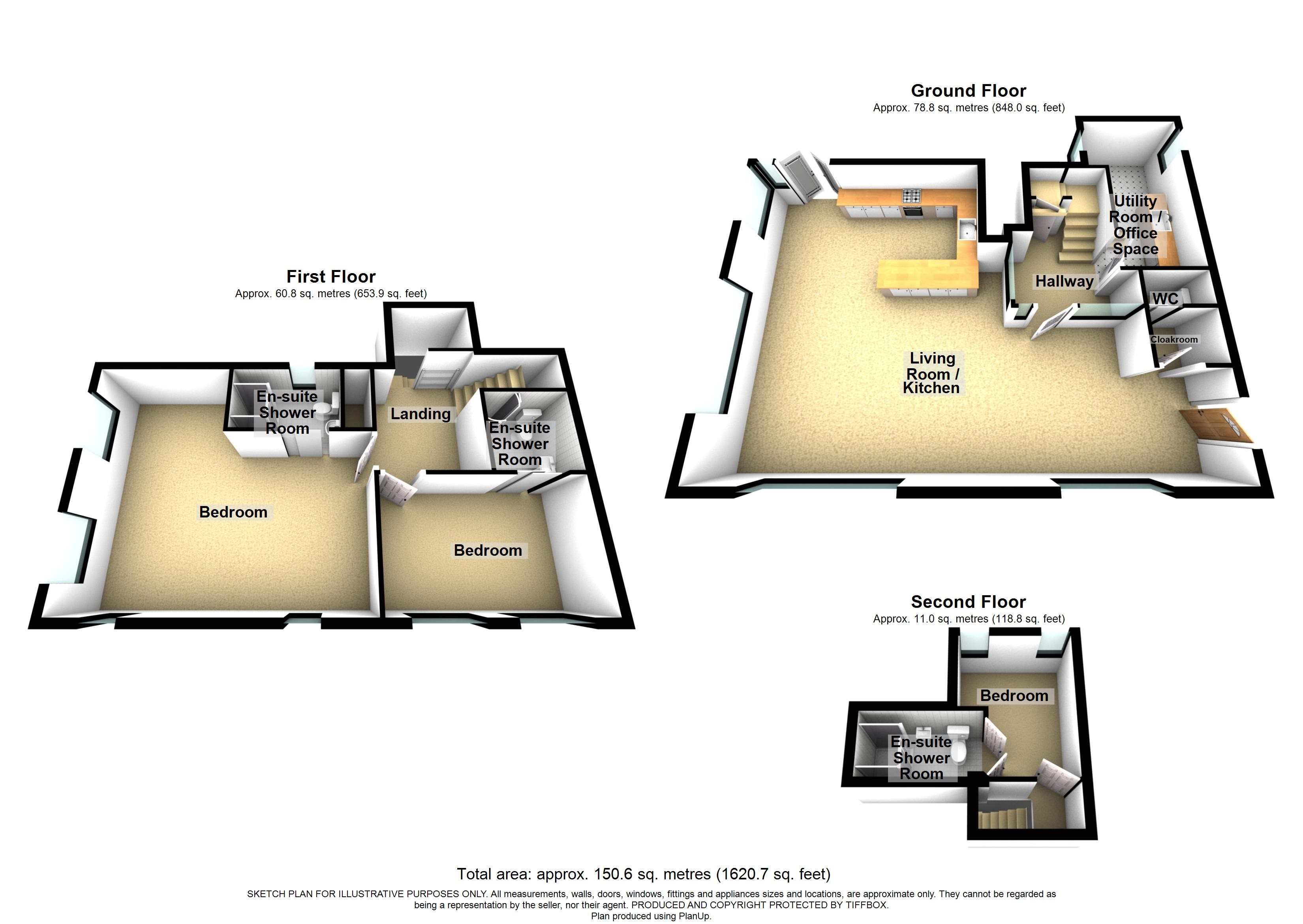 This exceptional three-bedroom split level apartment over 2 floors, comprises: Entrance via a communal reception hall featuring solid oak herringbone flooring and a unique stained-glass window. Entrance into the apartment with cloakroom/WC, an impressive open-plan living and dining area, and a contemporary kitchen fitted with new units and integrated appliances. An oak staircase leads to the mezzanine floor, which includes a utility room and offer's space for a study area. On the first floor, the master bedroom boasts outstanding views and an en-suite shower room, while the second bedroom also benefits from its own en-suite. A further staircase leads to the second floor, where you?ll find a third bedroom with an additional en-suite shower room.