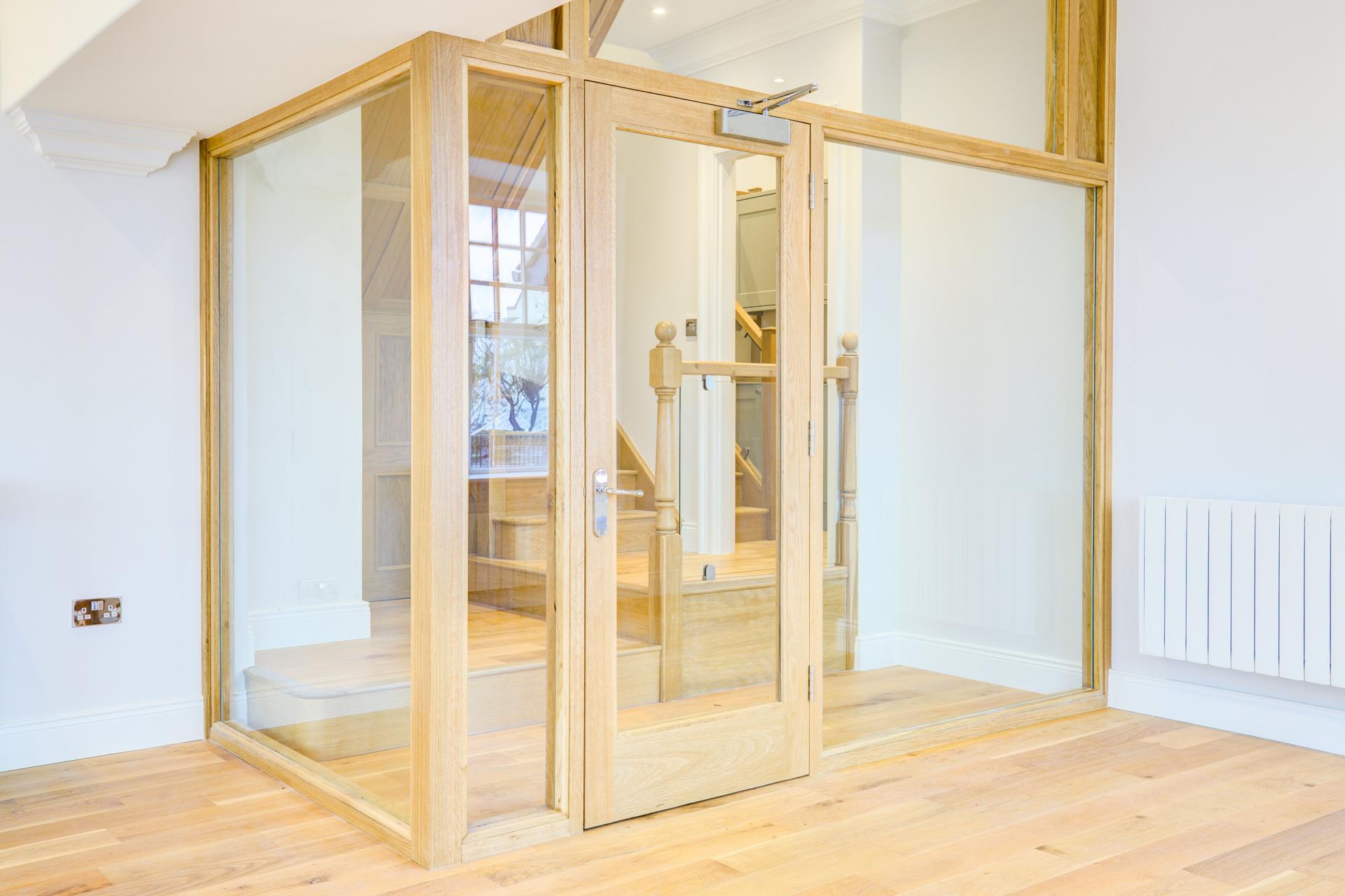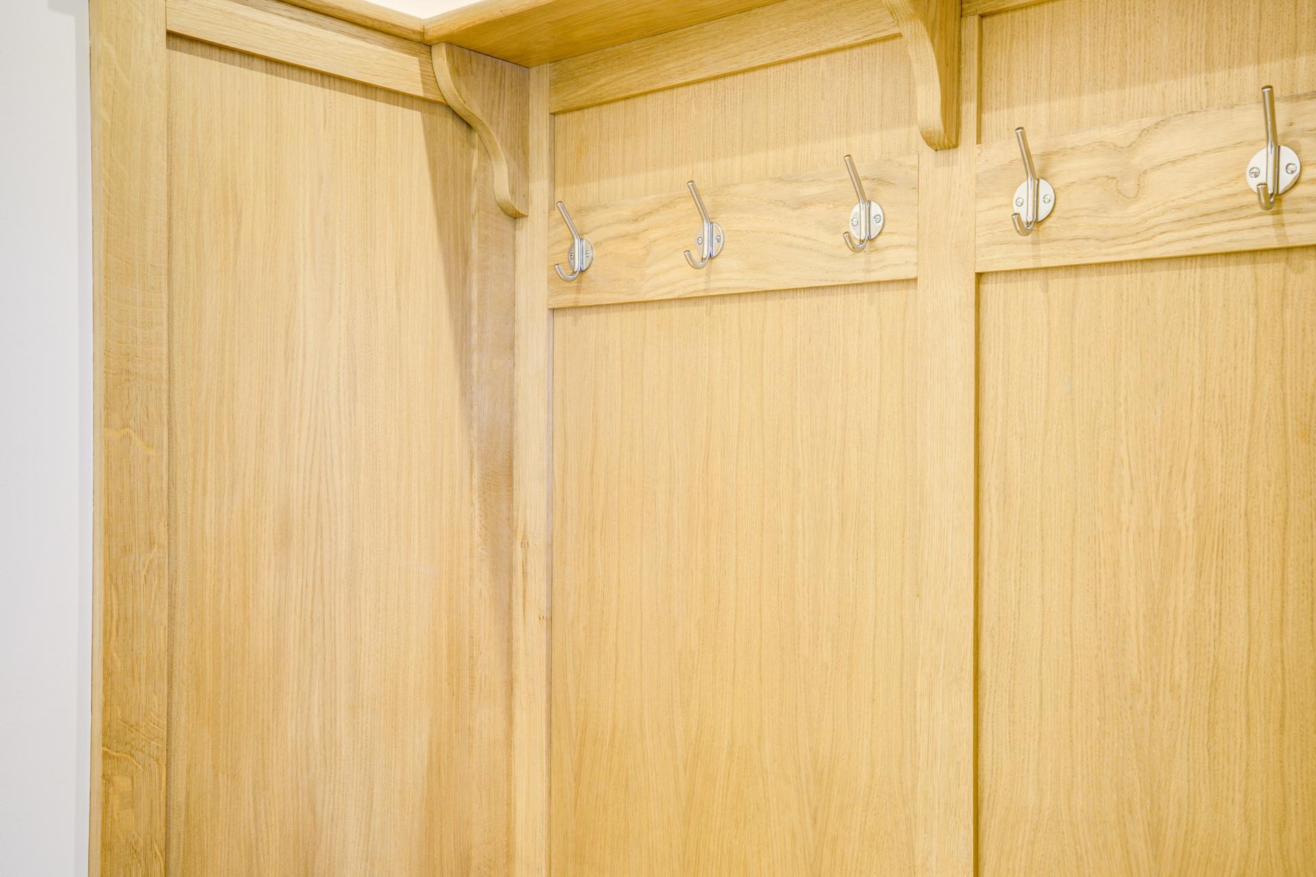 Hand made solid oak seat and coat hanging area, oak flooring and sliding door into...