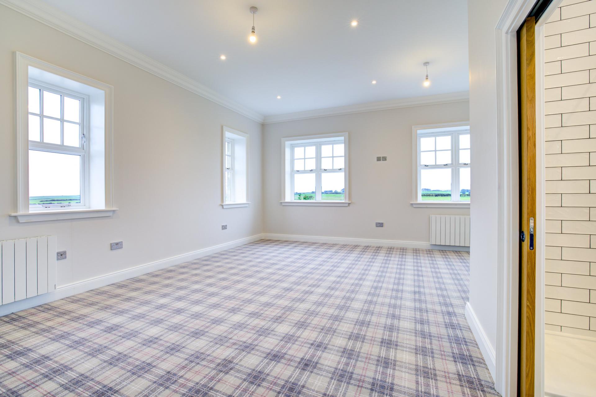 Cornicing, two wall mounted 'Rointe' electric thermostatic heaters with bluetooth control, views towards The Cheviots, The Farne Islands & Seahouses. Sliding doors to...