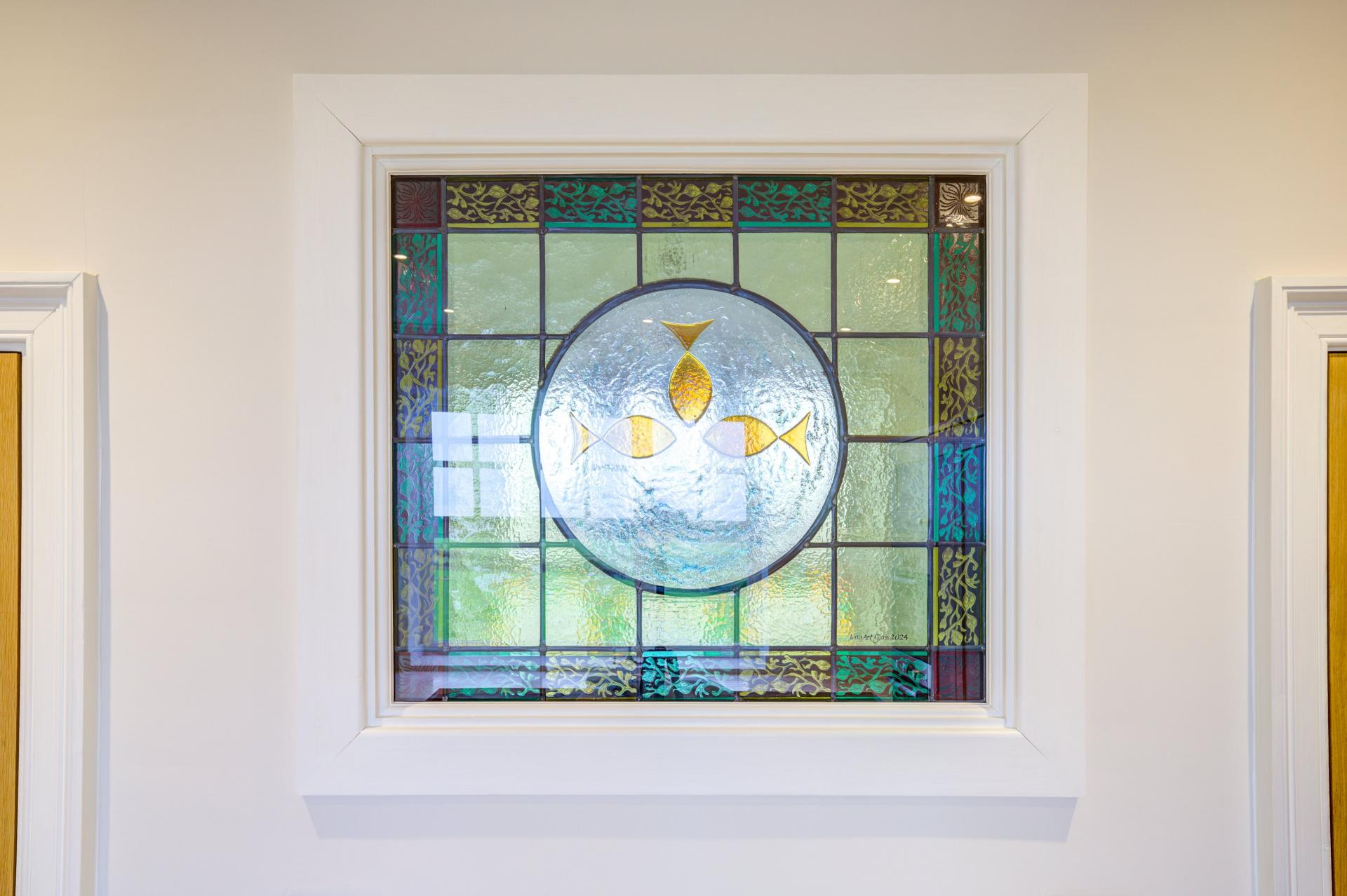 Half height panelling, revealed stone wall, solid oak herringbone floor, stained glass window.
